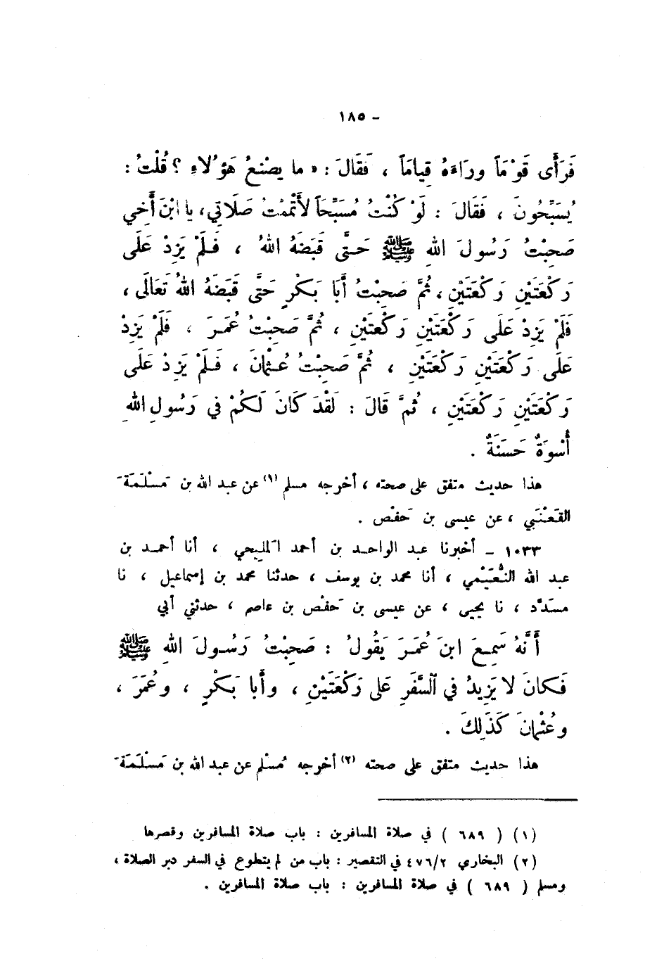 1033 - أَخْبَرَنَا عَبْدُ الْوَاحِدِ بْنُ أَحْمَدَ الْمَلِيحِيُّ، أَنا أَحْمَدُ بْنُ عَبْدِ اللَّهِ النُّعَيْمِيُّ، أَنا مُحَمَّدُ بْنُ يُوسُفَ، حَدَّثَنَا مُحَمَّدُ بْنُ إِسْمَاعِيلَ، نَا مُسَدَّدٌ، نَا يَحْيَى، عَنْ عِيسَى بْنِ حَفْصِ بْنِ عَاصِمٍ، حَدَّثَنِي أَبِي، أَنَّهُ سَمِعَ ابْنَ عُمَرَ، يَقُولُ: «صَحِبْتُ رَسُولَ اللَّهِ صَلَّى اللهُ عَلَيْهِ وَسَلَّمَ، فَكَانَ لَا يَزِيدُ فِي السَّفَرِ عَلَى رَكْعَتَيْنِ، وَأَبَا بَكْرٍ، وَعُمَرَ، وَعُثْمَانَ كَذَلِكَ».