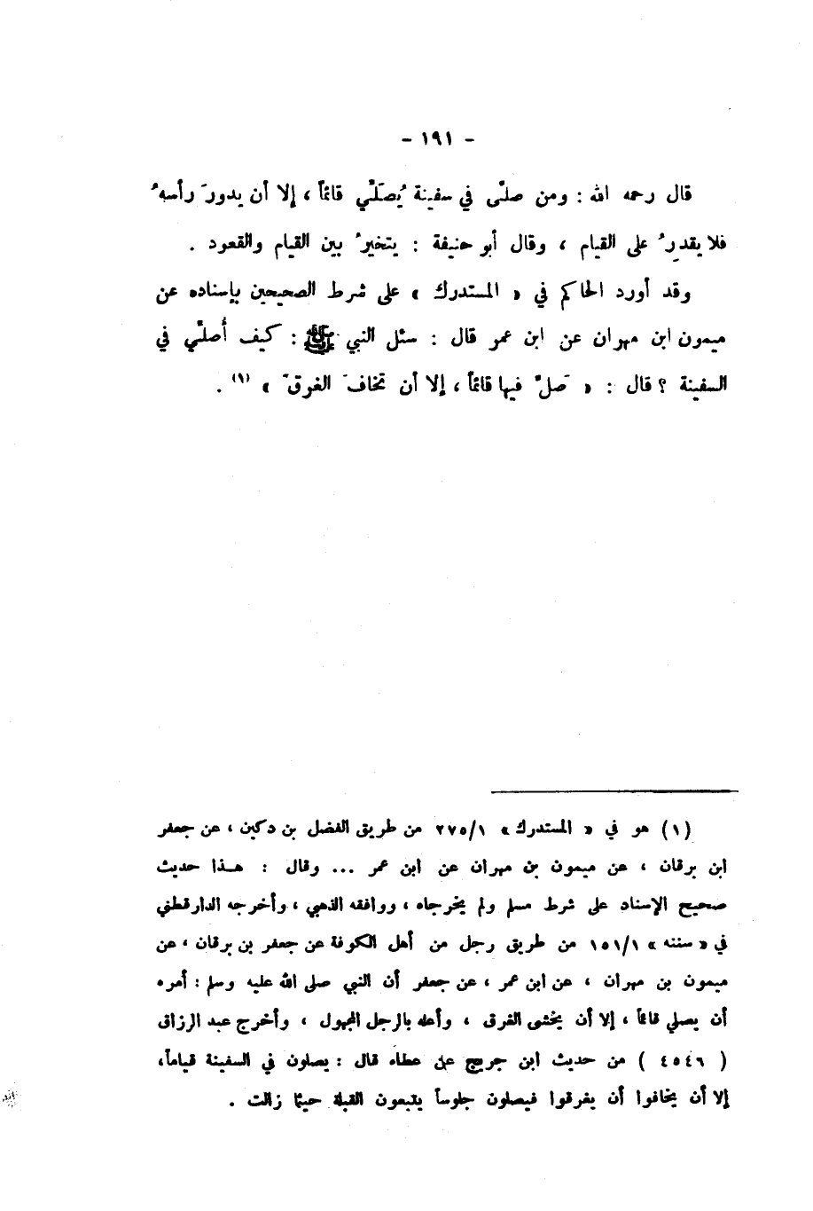 وَقَدْ أَوْرَدَ الْحَاكِمُ فِي الْمُسْتَدْرَكِ عَلَى شَرْطِ الصَّحِيحَيْنِ بِإِسْنَادِهِ، عَنْ مَيْمُونِ بْنِ مَهْرَانَ، عَنِ ابْنِ عُمَرَ، قَالَ: سُئِلَ النَّبِيُّ صَلَّى اللهُ عَلَيْهِ وَسَلَّمَ: كَيْفَ أُصَلِّي فِي السَّفِينَةِ؟ قَالَ: «صَلِّ فِيهَا قَائِمًا، إِلا أَنْ تَخَافَ الْغَرَقَ».