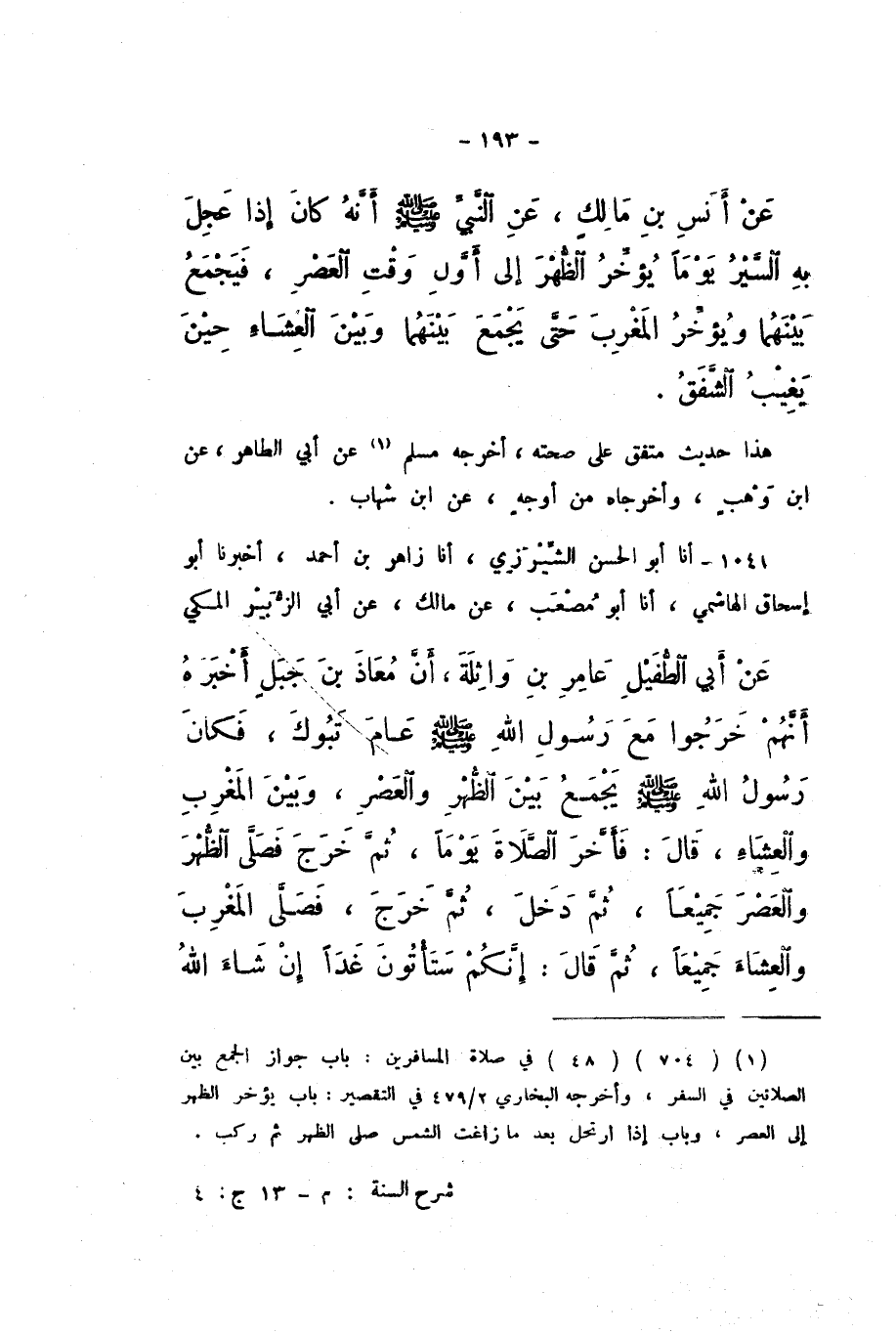 1041 - أَنا أَبُو الْحَسَنِ الشِّيرَزِيُّ، أَنا زَاهِرُ بْنُ أَحْمَدَ، أَخْبَرَنَا أَبُو إِسْحَاقَ الْهَاشِمِيُّ، أَنا أَبُو مُصْعَبٍ، عَنْ مَالِكٍ، عَنْ أَبِي الزُّبَيْرِ الْمَكِّيِّ، عَنِ أَبِي الطُّفَيْلِ عَامِرِ بْنِ وَاثِلَةَ، أَنَّ مُعَاذَ بْنَ جَبَلٍ، أَخْبَرَهُ أَنَّهُمْ خَرَجُوا مَعَ رَسُولِ اللَّهِ صَلَّى اللهُ عَلَيْهِ وَسَلَّمَ عَامَ تَبُوكَ، فَكَانَ رَسُولُ اللَّهِ صَلَّى اللهُ عَلَيْهِ وَسَلَّمَ يَجْمَعُ بَيْنَ الظُّهْرِ وَالْعَصْرِ، وَبَيْنَ الْمَغْرِبِ وَالْعِشَاءِ، قَالَ: فَأَخَّرَ الصَّلاةَ يَوْمًا، ثُمَّ خَرَجَ، فَصَلَّى الظُّهْرَ وَالْعَصْرَ جَمِيعًا، ثُمَّ دَخَلَ، ثُمَّ خَرَجَ، فَصَلَّى الْمَغْرِبَ وَالْعِشَاءَ جَمِيعًا، ثُمَّ قَالَ: إِنَّكُمْ سَتَأْتُونَ غَدًا إِنْ شَاءَ اللَّهُ