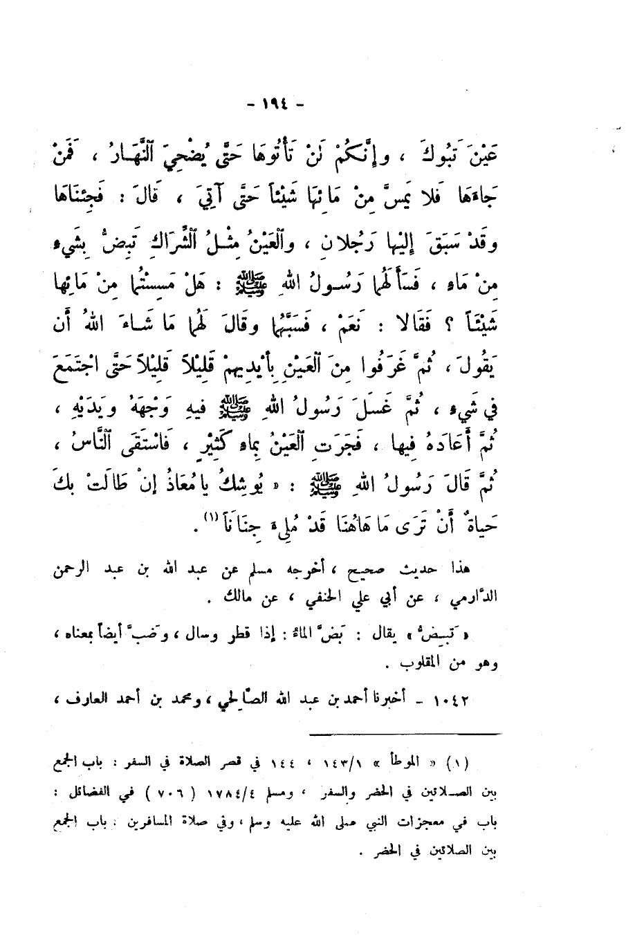 عَيْنَ تَبُوكَ، وَإِنَّكُمْ لَنْ تَأْتُوهَا حَتَّى يُضْحِيَ النَّهَارُ، فَمَنْ جَاءَهَا فَلا يَمَسَّ مِنْ مَائِهَا شَيْئًا حَتَّى آتِيَ، قَالَ: فَجِئْنَاهَا، وَقَدْ سَبَقَ إِلَيْهَا رَجُلانِ، وَالْعَيْنُ مِثْلُ الشِّرَاكِ تَبِضُّ بِشَيْءٍ مِنْ مَاءٍ، فَسَأَلَهُمَا رَسُولُ اللَّهِ صَلَّى اللهُ عَلَيْهِ وَسَلَّمَ: " هَلْ مَسِسْتُمَا مِنْ مَائِهَا شَيْئًا؟ فَقَالا: نَعَمْ.