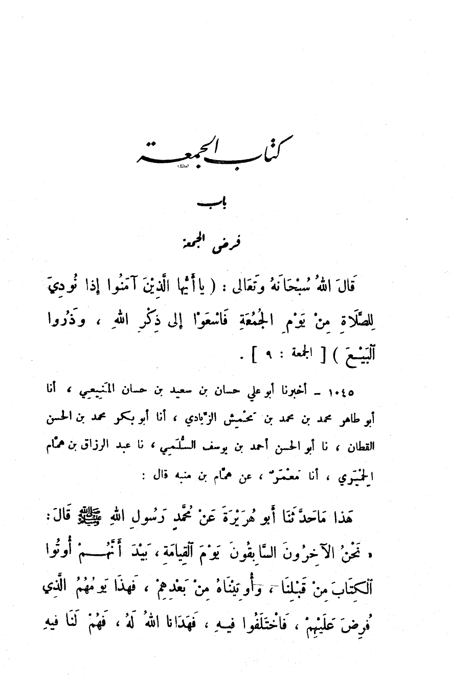 1045 - أَخْبَرَنَا أَبُو عَلِيٍّ حَسَّانُ بْنُ سَعِيدِ بْنِ حَسَّانٍ الْمَنِيعِيُّ، أَنا أَبُو طَاهِرٍ مُحَمَّدُ بْنُ مُحَمَّدِ بْنِ مَحْمِشٍ الزِّيَادِيُّ، أَنا أَبُو بَكْرٍ مُحَمَّدُ بْنُ الْحَسَنِ الْقَطَّانُ، نَا أَبُو الْحَسَنِ أَحْمَدُ بْنُ يُوسُفَ السُّلَمِيُّ، نَا عَبْدُ الرَّزَّاقِ بْنُ هَمَّامٍ الْحِمْيَرِيُّ، أَنا مَعْمَرٌ، عَنْ هَمَّامِ بْنِ مُنَبِّهٍ، قَالَ: هَذَا مَا حَدَّثَنَا أَبُو هُرَيْرَةَ، عَنْ مُحَمَّدٍ رَسُولِ اللَّهِ صَلَّى اللهُ عَلَيْهِ وَسَلَّمَ، قَالَ: «نَحْنُ الآخِرُونَ السَّابِقُونَ يَوْمَ الْقِيَامَةِ، بَيْدَ أَنَّهُمْ أُوتُوا الْكِتَابَ مِنْ قَبْلِنَا، وَأُوتِينَاهُ مِنْ بَعْدِهِمْ، فَهَذَا يَوْمُهُمُ الَّذِي فُرِضَ عَلَيْهِمْ، فَاخْتَلَفُوا فِيهِ، فَهَدَانَا اللَّهُ لَهُ، فَهُمْ لَنَا فِيهِ