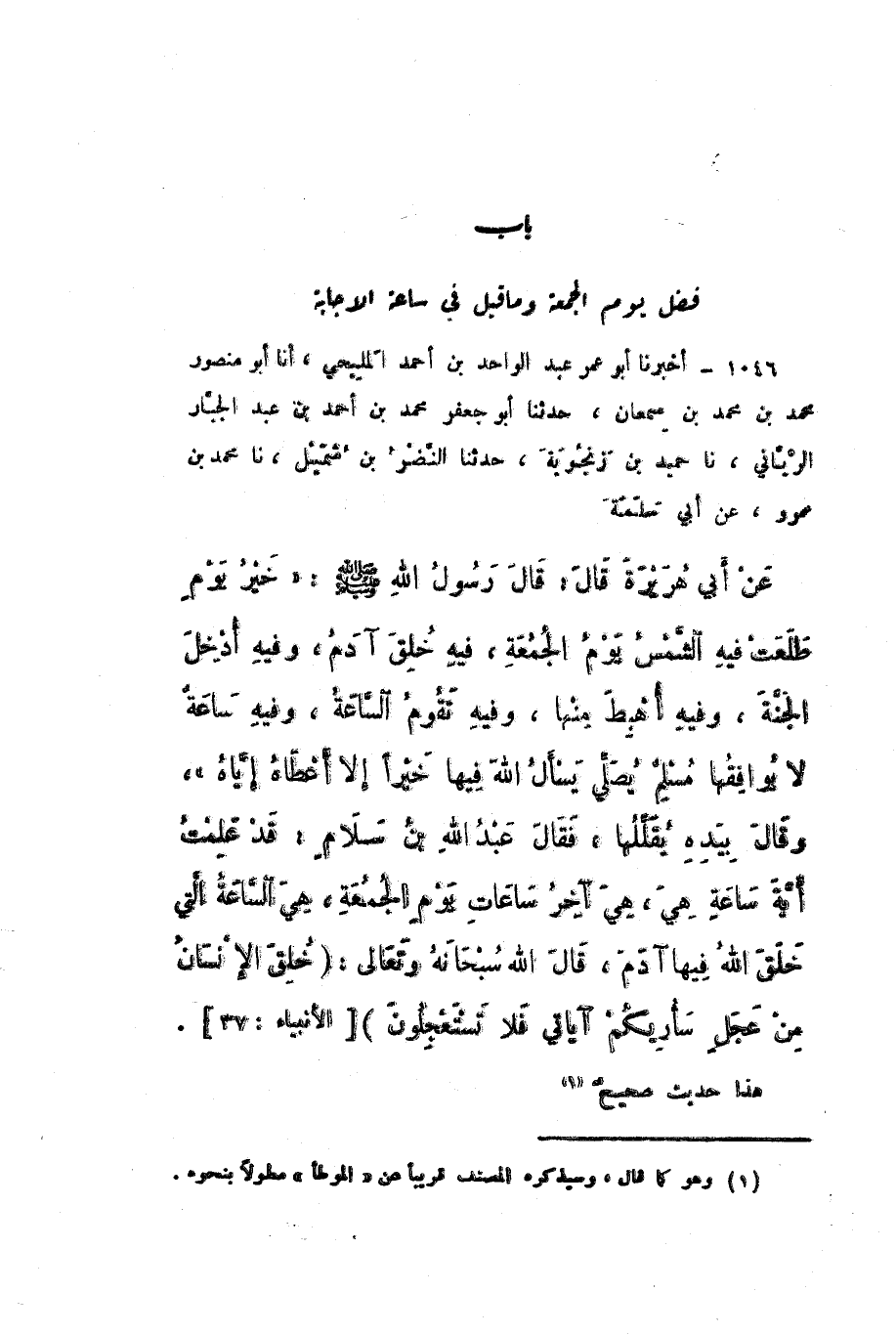 1046 - أَخْبَرَنَا أَبُو عُمَرَ عَبْدُ الْوَاحِدِ بْنُ أَحْمَدَ الْمَلِيحِيُّ، أَنا أَبُو مَنْصُورٍ مُحَمَّدُ بْنُ مُحَمَّدِ بْنِ سَمْعَانَ، حَدَّثَنَا أَبُو جَعْفَرٍ مُحَمَّدُ بْنُ أَحْمَدَ بْنِ عَبْدِ الْجَبَّارِ الرَّيَّانِيُّ، نَا حُمَيْدُ بْنُ زَنْجُوَيْهِ، حَدَّثَنَا النَّضْرُ بْنُ شُمَيْلٍ، نَا مُحَمَّدُ بْنُ عَمْرٍو، عَنْ أَبِي سَلَمَةَ، عَنْ أَبِي هُرَيْرَةَ، قَالَ: قَالَ رَسُولُ اللَّهِ صَلَّى اللهُ عَلَيْهِ وَسَلَّمَ: «خَيْرُ يَوْمٍ طَلَعَتْ فِيهِ الشَّمْسُ يَوْمُ الْجُمُعَةِ، فِيهِ خُلِقَ آدَمُ، وَفِيهِ أُدْخِلَ الْجَنَّةَ، وَفِيهِ أُهْبِطَ مِنْهَا، وَفِيهِ تَقُومُ السَّاعَةُ، وَفِيهِ سَاعَةٌ لَا يُوَافِقُهَا مُسْلِمٌ يُصَلِّي يَسْأَلُ اللَّهَ فِيهَا خَيْرًا إِلا أَعْطَاهُ إِيَّاهُ»، وَقَالَ بِيَدِهِ يُقَلِّلُهَا، فَقَالَ عَبْدُ اللَّهِ بْنُ سَلامٍ: قَدْ عَلِمْتُ أَيَّةَ سَاعَةٍ هِيَ، هِيَ آخِرُ سَاعَاتِ يَوْمِ الْجُمُعَةِ، هِيَ السَّاعَةُ الَّتِي خَلَقَ اللَّهُ فِيهَا آدَمَ، قَالَ اللَّهُ سُبْحَانَهُ وَتَعَالَى: {خُلِقَ الإِنْسَانُ مِنْ عَجَلٍ سَأُرِيكُمْ آيَاتِي فَلا تَسْتَعْجِلُونِ} [الْأَنْبِيَاء: 37].