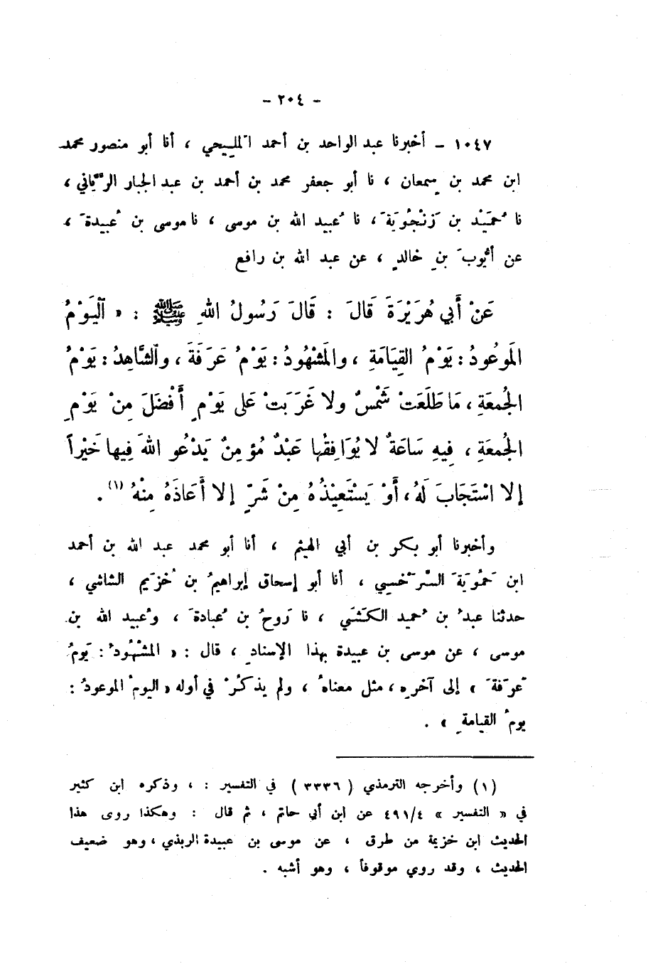 1047 - أَخْبَرَنَا عَبْدُ الْوَاحِدِ بْنُ أَحْمَدَ الْمَلِيحِيُّ، أَنا أَبُو مَنْصُورٍ مُحَمَّدُ بْنُ مُحَمَّدِ بْنِ سَمْعَانَ، نَا أَبُو جَعْفَرٍ مُحَمَّدُ بْنُ أَحْمَدَ بْنِ عَبْدِ الْجَبَّارِ الرَّيَّانِيُّ، نَا حُمَيْدُ بْنُ زَنْجُوَيْهِ، نَا عُبَيْدُ اللَّهِ بْنُ مُوسَى، نَا مُوسَى بْنُ عُبَيْدَةَ، عَنْ أَيُّوبَ بْنِ خَالِدٍ، عَنْ عَبْدِ اللَّهِ بْنِ رَافِعٍ، عَنْ أَبِي هُرَيْرَةَ، قَالَ: قَالَ رَسُولُ اللَّهِ صَلَّى اللهُ عَلَيْهِ وَسَلَّمَ: " الْيَوْمُ الْمَوْعُودُ: يَوْمُ الْقِيَامَةِ، وَالْمَشْهُودُ: يَوْمُ عَرَفَةَ، وَالشَّاهِدُ: يَوْمُ الْجُمُعَةِ، مَا طَلَعَتْ شَمْسٌ وَلا غَرَبَتْ عَلَى يَوْمٍ أَفْضَلَ مِنْ يَوْمِ الْجُمُعَةِ، فِيهِ سَاعَةٌ لَا يُوَافِقُهَا عَبْدٌ مُؤْمِنٌ يَدْعُو اللَّهَ فِيهَا خَيْرًا إِلا اسْتَجَابَ لَهُ، أَوْ يَسْتَعِيذُهُ مِنْ شَرٍّ إِلا أَعَاذَهُ مِنْهُ ".