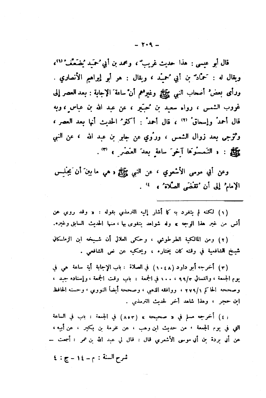 قَالَ أَبُو عِيسَى: هَذَا حَدِيثٌ غَرِيبٌ، وَمُحَمَّدُ بْنُ أَبِي حُمَيْدٍ يُضَعَّفُ، وَيُقَالُ لَهُ: حَمَّادُ بْنُ أَبِي حُمَيْدٍ، وَيُقَالُ: هُوَ أَبُو إِبْرَاهِيمَ الأَنْصَارِيُّ، وَرَأَى بَعْضُ أَصْحَابِ النَّبِيِّ صَلَّى اللهُ عَلَيْهِ وَسَلَّمَ وَغَيْرُهُمْ، أَنَّ سَاعَةَ الإِجَابَةِ: بَعْدَ الْعَصْرِ إِلَى غُرُوبِ الشَّمْسِ، رَوَاهُ سَعِيدُ بْنُ جُبَيْرٍ، عَنْ عَبْدِ اللَّهِ بْنِ عَبَّاسٍ، وَبِهِ قَالَ أَحْمَدُ، وَإِسْحَاقُ، قَالَ أَحْمَدُ: أَكْثَرُ الْحَدِيثِ أَنَّهَا بَعْدَ الْعَصْرِ، وَتُرْجَى بَعْدَ زَوَالِ الشَّمْسِ، وَرُوِيَ عَنْ جَابِرِ بْنِ عَبْدِ اللَّهِ، عَنِ النَّبِيِّ صَلَّى اللهُ عَلَيْهِ وَسَلَّمَ: «الْتَمِسُوهَا آخِرَ سَاعَةٍ بَعْدَ الْعَصْرِ».