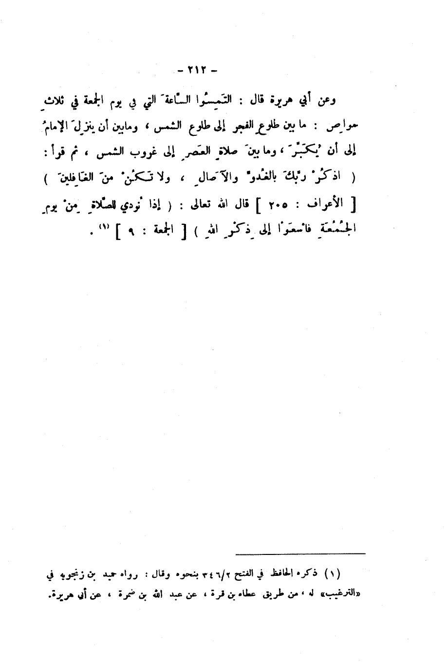 وَعَنْ أَبِي هُرَيْرَةَ، قَالَ: الْتَمِسُوا السَّاعَةَ الَّتِي فِي يَوْمِ الْجُمُعَةِ فِي ثَلاثِ مَوَاطِنَ: مَا بَيْنَ طُلُوعِ الْفَجْرِ إِلَى طُلُوعِ الشَّمْسِ، وَمَا بَيْنَ أَنْ يَنْزِلَ الإِمَامُ إِلَى أَنْ يُكَبِّرَ، وَمَا بَيْنَ صَلاةِ الْعَصْرِ إِلَى غُرُوبِ الشَّمْسِ، ثُمَّ قَرَأَ: {وَاذْكُرْ رَبَّكَ فِي نَفْسِكَ تَضَرُّعًا وَخِيفَةً وَدُونَ الْجَهْرِ مِنَ الْقَوْلِ بِالْغُدُوِّ وَالآصَالِ وَلا تَكُنْ مِنَ الْغَافِلِينَ} [الْأَعْرَاف: 205] قَالَ اللَّهُ تَعَالَى: {إِذَا نُودِيَ لِلصَّلاةِ مِنْ يَوْمِ الْجُمُعَةِ فَاسْعَوْا إِلَى ذِكْرِ اللَّهِ} [الْجُمُعَة: 9]
