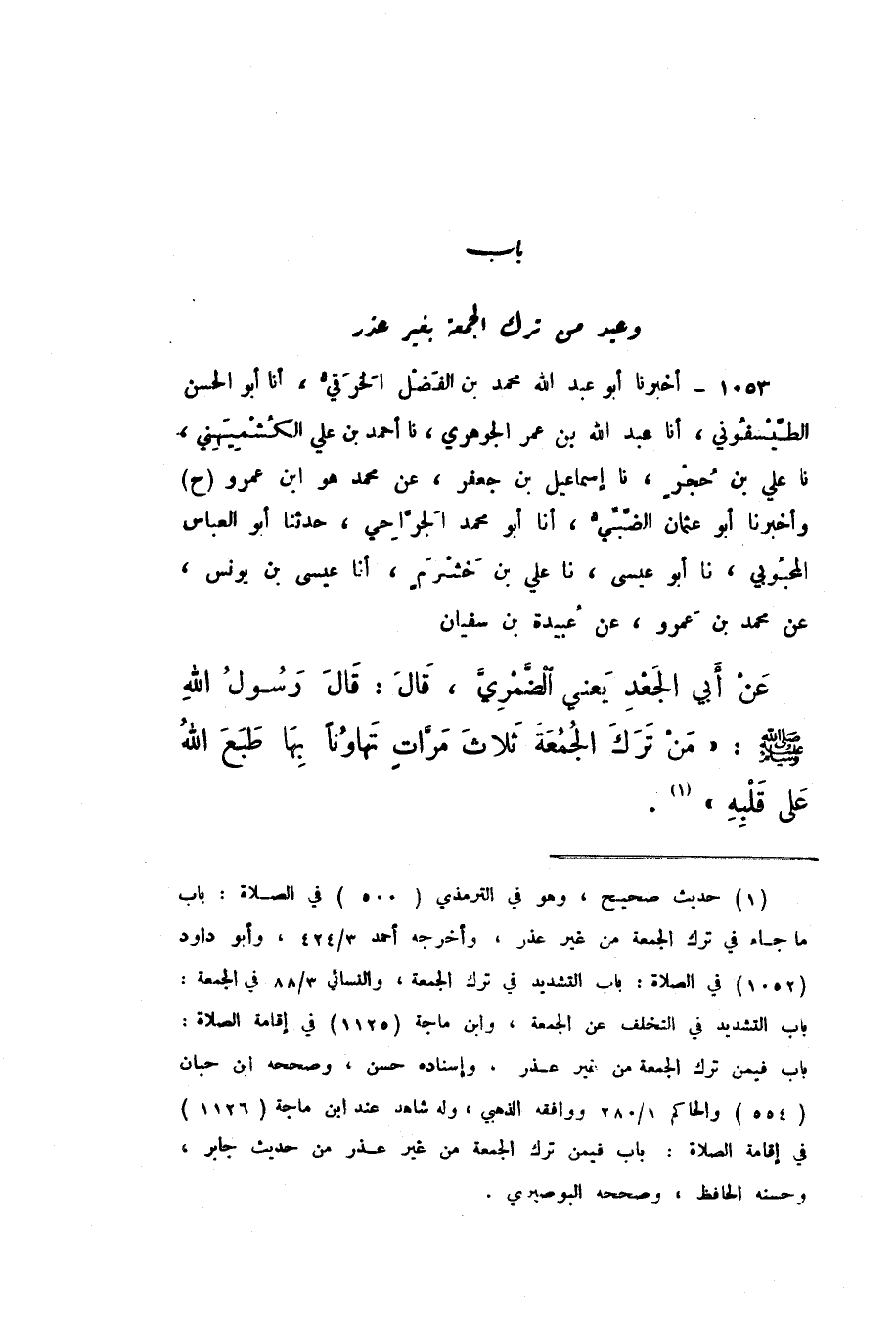 ح وَأَخْبَرَنَا أَبُو عُثْمَانَ الضَّبِّيُّ، أَنا أَبُو مُحَمَّدٍ الْجَرَّاحِيُّ، حَدَّثَنَا أَبُو الْعَبَّاسِ الْمَحْبُوبِيُّ، نَا أَبُو عِيسَى، نَا عَلِيُّ بْنُ خَشْرَمٍ، أَنا عِيسَى بْنُ يُونُسَ، عَنْ مُحَمَّدِ بْنِ عَمْرٍو، عَنْ عُبَيْدَةَ بْنِ سُفْيَانَ، عَنْ أَبِي الْجَعْدِ، يَعْنِي الضَّمْرِيَّ، قَالَ: قَالَ رَسُولُ اللَّهِ صَلَّى اللهُ عَلَيْهِ وَسَلَّمَ: «مَنْ تَرَكَ الْجُمُعَةَ ثَلاثَ مَرَّاتٍ تَهَاوُنًا بِهَا طَبَعَ اللَّهُ عَلَى قَلْبِهِ».