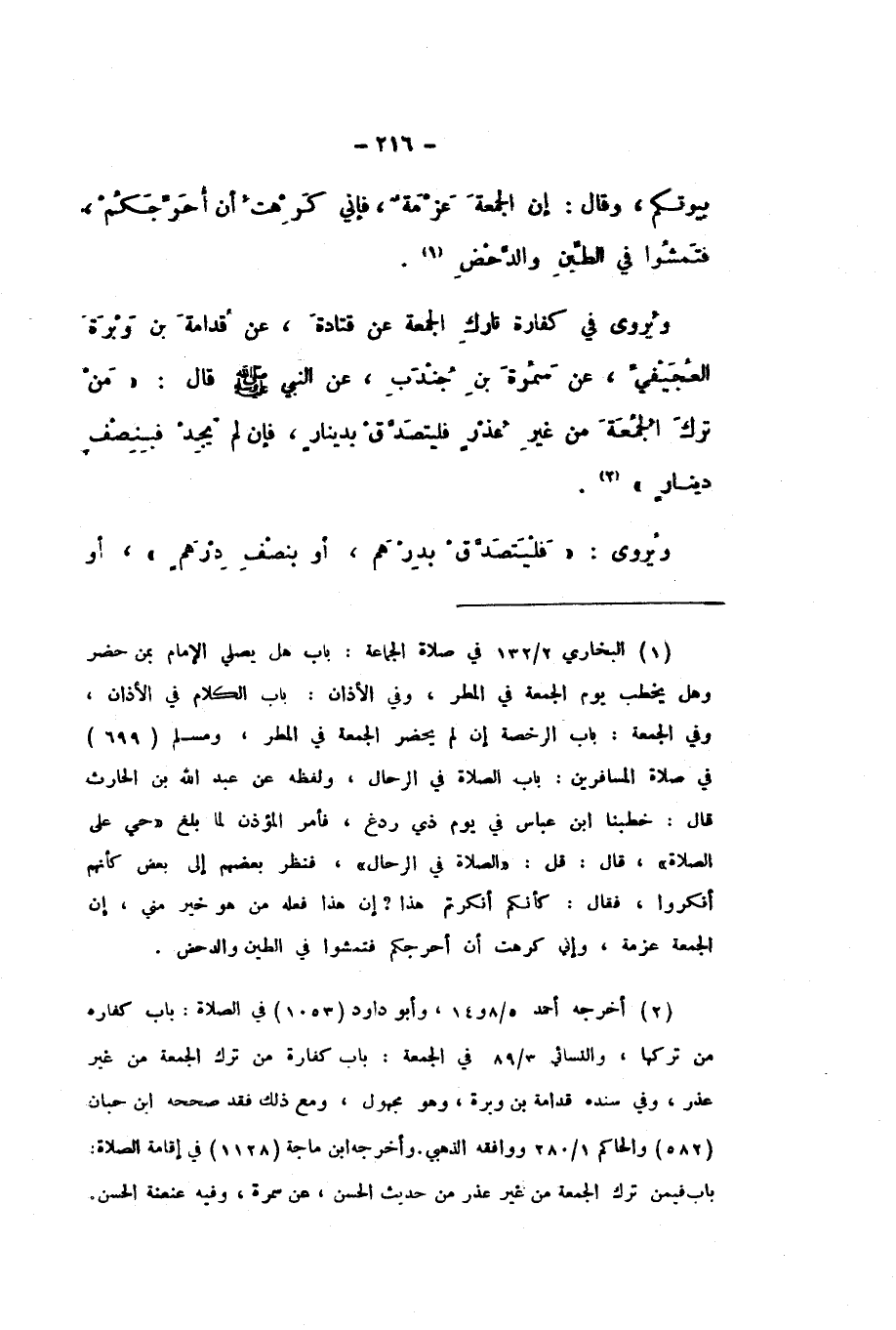 وَيُرْوَى فِي كَفَّارَةِ تَارِكِ الْجُمُعَةِ، عَنْ قَتَادَةَ، عَنْ قُدَامَةَ بْنِ وَبْرَةَ الْعُجَيْفِيِّ، عَنْ سَمُرَةَ بْنِ جُنْدُبٍ، عَنِ النَّبِيِّ صَلَّى اللهُ عَلَيْهِ وَسَلَّمَ، قَالَ: «مَنْ تَرَكَ الْجُمُعَةَ مِنْ غَيْرِ عُذْرٍ فَلْيَتَصَدَّقْ بِدِينَارٍ، فَإِنْ لَمْ يَجِدْ فَبِنِصْفِ دِينَارٍ».