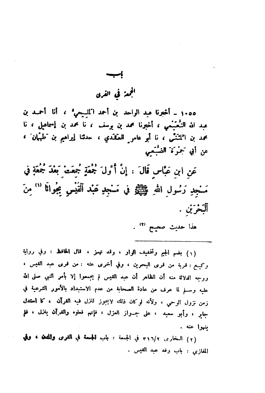 1055 - أَخْبَرَنَا عَبْدُ الْوَاحِدِ بْنُ أَحْمَدَ الْمَلِيحِيُّ، أَنا أَحْمَدُ بْنُ عَبْدِ اللَّهِ النُّعَيْمِيُّ، أَخْبَرَنَا مُحَمَّدُ بْنُ يُوسُفَ، نَا مُحَمَّدُ بْنُ إِسْمَاعِيلَ، نَا مُحَمَّدُ بْنُ الْمُثَنَّى، نَا أَبُو عَامِرٍ الْعَقَدِيُّ، حَدَّثَنَا إِبْرَاهِيمُ بن طَهْمَانَ، عَنْ أَبِي جَمْرَةَ الضُّبَعِيِّ، عَنِ ابْنِ عَبَّاسٍ، قَالَ: «إِنَّ أَوَّلَ جُمُعَةٍ جُمِعَتْ بَعْدَ جُمُعَةٍ فِي مَسْجِدِ رَسُولِ اللَّهِ صَلَّى اللهُ عَلَيْهِ وَسَلَّمَ فِي مَسْجِدِ عَبْدِ الْقَيْسِ بِجُوَاثَا مِنَ الْبَحْرَيْنِ».