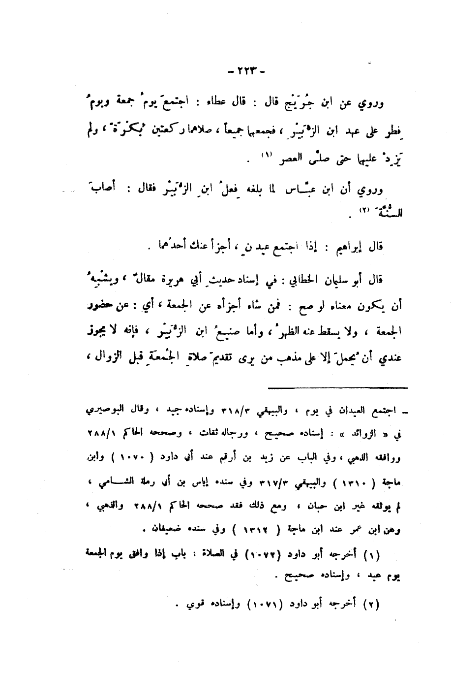 وَرُوِيَ عَنِ ابْنِ جُرَيْجٍ، قَالَ: قَالَ عَطَاءٌ: اجْتَمَعَ يَوْمُ جُمُعَةٍ وَيَوْمُ فِطْرٍ عَلَى عَهْدِ ابْنِ الزُّبَيْرِ، فَجَمَّعَهُمَا جَمِيعًا، صَلاهُمَا رَكْعَتَيْنِ بُكْرَةً، وَلَمْ يَزِدْ عَلَيْهِمَا حَتَّى صَلَّى الْعَصْرَ.