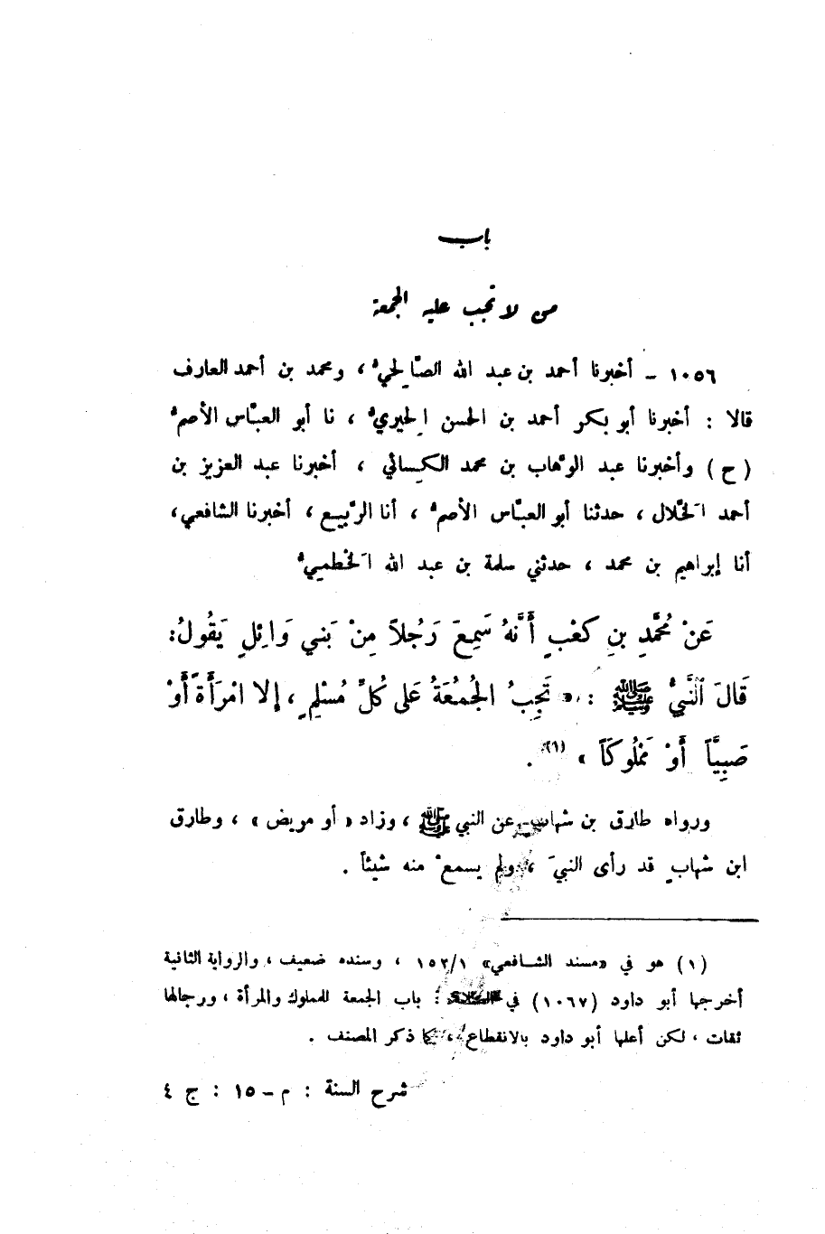 ح وَأَخْبَرَنَا عَبْدُ الْوَهَّابِ بْنُ مُحَمَّدٍ الْكِسَائِيُّ، أَخْبَرَنَا عَبْدُ الْعَزِيزِ بْنُ أَحْمَدَ الْخَلالُ، حَدَّثَنَا أَبُو الْعَبَّاسِ الأَصَمُّ، أَنا الرَّبِيعُ، أَخْبَرَنَا الشَّافِعِيُّ، أَنا إِبْرَاهِيمُ بْنُ مُحَمَّدٍ، حَدَّثَنِي سَلَمَةُ بْنُ عَبْدِ اللَّهِ الْخَطْمِيُّ، عَنْ مُحَمَّدِ بْنِ كَعْبٍ، أَنَّهُ سَمِعَ رَجُلا مِنْ بَنِي وَائِلٍ، يَقُولُ: قَالَ النَّبِيُّ صَلَّى اللهُ عَلَيْهِ وَسَلَّمَ: «تَجِبُ الْجُمُعَةُ عَلَى كُلِّ مُسْلِمٍ، إِلا امْرَأَةً أَوْ صَبِيًّا أَوْ مَمْلُوكًا».