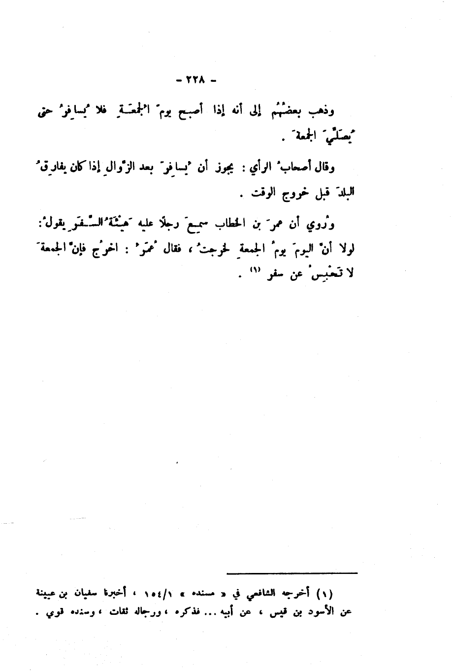 وَرُوِيَ أَنَّ عُمَرَ بْنَ الْخَطَّابِ سَمِعَ رَجُلا عَلَيْهِ هَيْئَةُ السَّفَرِ، يَقُولُ: لَوْلا أَنَّ الْيَوْمَ يَوْمُ الْجُمُعَةِ لَخَرَجْتُ، فَقَالَ عُمَرُ: اخْرُجْ فَإِنَّ الْجُمُعَةَ لَا تَحْبِسُ عَنْ سَفَرٍ