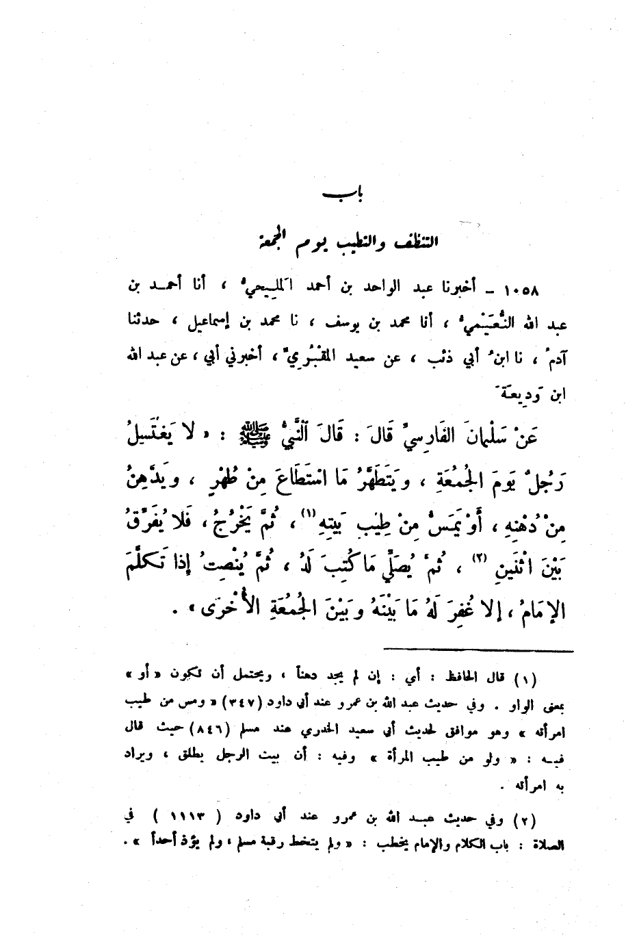 1058 - أَخْبَرَنَا عَبْدُ الْوَاحِدِ بْنُ أَحْمَدَ الْمَلِيحِيُّ، أَنا أَحْمَدُ بْنُ عَبْدِ اللَّهِ النُّعَيْمِيُّ، أَنا مُحَمَّدُ بْنُ يُوسُفَ، نَا مُحَمَّدُ بْنُ إِسْمَاعِيلَ، حَدَّثَنَا آدَمُ، نَا ابْنُ أَبِي ذِئْبٍ، عَنْ سَعِيدٍ الْمَقْبُرِيِّ، أَخْبَرَنِي أَبِي، عَنْ عَبْدِ اللَّهِ بْنِ وَدِيعَةَ، عَنْ سَلْمَانَ الْفَارِسِيِّ، قَالَ: قَالَ النَّبِيُّ صَلَّى اللهُ عَلَيْهِ وَسَلَّمَ: «لَا يَغْتَسِلُ رَجُلٌ يَوْمَ الْجُمُعَةِ، وَيَتَطَهَّرُ مَا اسْتَطَاعَ مِنْ طُهْرٍ، وَيَدَّهِنُ مِنْ دُهْنِهِ، أَوْ يَمَسُّ مِنْ طِيبِ بَيْتِهِ، ثُمَّ يَخْرُجُ، فَلا يُفَرِّقُ بَيْنَ اثْنَيْنِ، ثُمَّ يُصَلِّي مَا كُتِبَ لَهُ، ثُمَّ يُنْصِتُ إِذَا تَكَلَّمَ الإِمَامُ، إِلا غُفِرَ لَهُ مَا بَيْنَهُ، وَبَيْنَ الْجُمُعَةِ الأُخْرَى».