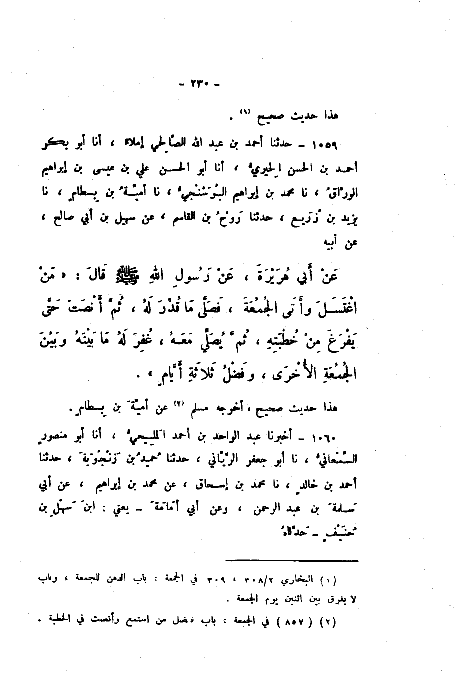 1059 - حَدَّثَنَا أَحْمَدُ بْنُ عَبْدِ اللَّهِ الصَّالِحِيُّ، إِمْلاءً، أَنا أَبُو بَكْرٍ أَحْمَدُ بْنُ الْحَسَنِ الْحِيرِيُّ، أَنا أَبُو الْحَسَنِ عَلِيُّ بْنُ عِيسَى بْنِ إِبْرَاهِيمَ الْوَرَّاقُ، نَا مُحَمَّدُ بْنُ إِبْرَاهِيمَ الْبُوشَنْجِيُّ، نَا أُمَيَّةُ بْنُ بِسْطَامٍ، نَا يَزِيدُ بْنُ زُرَيْعٍ، حَدَّثَنَا رَوْحُ بْنُ الْقَاسِمِ، عَنْ سُهَيْلِ بْنِ أَبِي صَالِحٍ، عَنْ أَبِيهِ، عَنْ أَبِي هُرَيْرَةَ، عَنْ رَسُولِ اللَّهِ صَلَّى اللهُ عَلَيْهِ وَسَلَّمَ، قَالَ: «مَنِ اغْتَسَلَ وَأَتَى الْجُمُعَةَ، فَصَلَّى مَا قُدِّرَ لَهُ، ثُمَّ أَنْصَتَ حَتَّى يَفْرُغَ مِنْ خُطْبَتِهِ، ثُمَّ يُصَلِّي مَعَهُ، غُفِرَ لَهُ مَا بَيْنَهُ وَبَيْنَ الْجُمُعَةِ الأُخْرَى، وَفَضْلُ ثَلاثَةِ أَيَّامٍ».