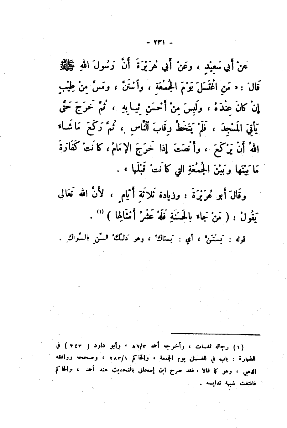 عَنْ أَبِي سَعِيدٍ، وَعَنْ أَبِي هُرَيْرَةَ، أَنَّ رَسُولَ اللَّهِ صَلَّى اللهُ عَلَيْهِ وَسَلَّمَ، قَالَ: «مَنِ اغْتَسَلَ يَوْمَ الْجُمُعَةِ، وَاسْتَنَّ، وَمَسَّ مِنْ طِيبٍ إِنْ كَانَ عِنْدَهُ، وَلَبِسَ مِنْ أَحْسَنِ ثِيَابِهِ، ثُمَّ خَرَجَ، حَتَّى يَأْتِيَ الْمَسْجِدَ، فَلَمْ يَتَخَطَّ رِقَابَ النَّاسِ، ثُمَّ رَكَعَ مَا شَاءَ اللَّهُ أَنْ يَرْكَعَ، وَأَنْصَتَ إِذَا خَرَجَ الإِمَامُ، كَانَتْ كَفَّارَةَ مَا بَيْنَهَا وَبَيْنَ الْجُمُعَةِ الَّتِي كَانَتْ قَبْلَهَا».