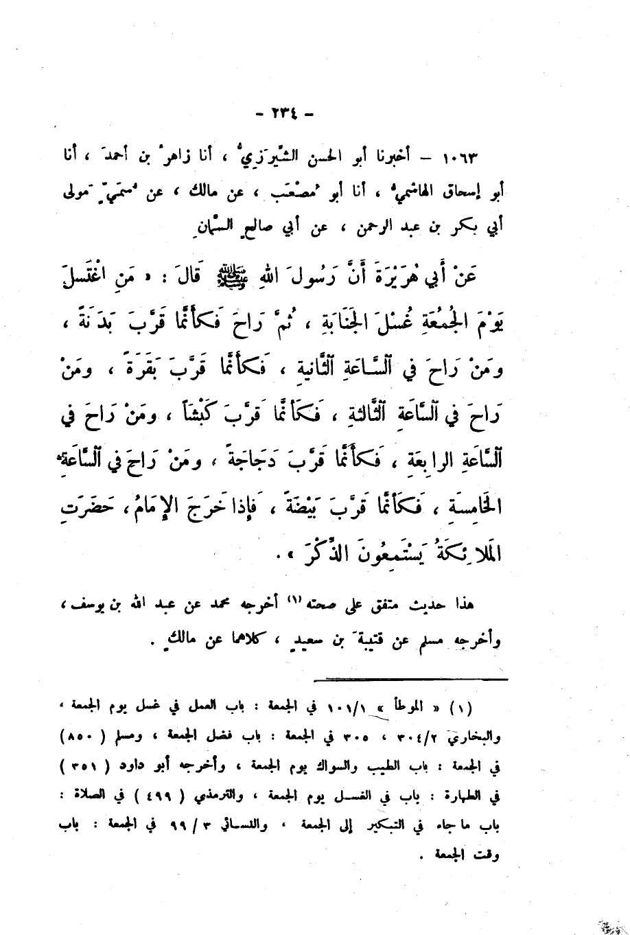 1063 - أَخْبَرَنَا أَبُو الْحَسَنِ الشِّيرَزِيُّ، أَنا زَاهِرُ بْنُ أَحْمَدَ، أَنا أَبُو إِسْحَاقَ الْهَاشِمِيُّ، أَنا أَبُو مُصْعَبٍ، عَنْ مَالِكٍ، عَنْ سُمَيٍّ مَوْلَى أَبِي بَكْرِ بْنِ عَبْدِ الرَّحْمَنِ، عَنْ أَبِي صَالِحٍ السَّمَّانِ، عَنْ أَبِي هُرِيرَةَ، أَنَّ رَسُولَ اللَّهِ صَلَّى اللهُ عَلَيْهِ وَسَلَّمَ، قَالَ: «مَنِ اغْتَسَلَ يَوْمَ الْجُمُعَةِ غُسْلَ الْجَنَابَةِ، ثُمَّ رَاحَ فَكَأَنَّمَا قَرَّبَ بَدَنَةً، وَمَنْ رَاحَ فِي السَّاعَةِ الثَّانِيَةِ، فَكَأَنَّمَا قَرَّبَ بَقَرَةً، وَمَنْ رَاحَ فِي السَّاعَةِ الثَّالِثَةِ، فَكَأَنَّمَا قَرَّبَ كَبْشًا، وَمَنْ رَاحَ فِي السَّاعَةِ الرَّابِعَةِ، فَكَأَنَّمَا قَرَّبَ دَجَاجَةً، وَمَنْ رَاحَ فِي السَّاعَةِ الْخَامِسَةِ، فَكَأَنَّمَا قَرَّبَ بَيْضَةً، فَإِذَا خَرَجَ الإِمَامُ، حَضَرَتِ الْمَلائِكَةُ يَسْتَمِعُونَ الذِّكْرَ».