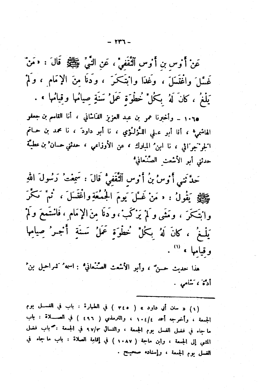 1065 - وَأَخْبَرَنَا عُمَرُ بْنُ عَبْدِ الْعَزِيزِ الْفَاشَانِيُّ، أَنا الْقَاسِمُ بْنُ جَعْفَرٍ الْهَاشِمِيُّ، أَنا أَبُو عَلِيٍّ اللُّؤْلُئِيُّ، نَا أَبُو دَاوُدَ، نَا مُحَمَّدُ بْنُ حَاتِمٍ الْجَرْجَرَائِيُّ، نَا ابْنُ الْمُبَارَكِ، عَنِ الأَوْزَاعِيِّ، حَدَّثَنِي حَسَّانُ بْنُ عَطِيَّةَ، حَدَّثَنِي أَبُو الأَشْعَثِ الصَّنْعَانِيُّ، حَدَّثَنِي أَوْسُ بْنُ أَوْسٍ الثَّقَفِيُّ، قَالَ: سَمِعْتُ رَسُولَ اللَّهِ صَلَّى اللهُ عَلَيْهِ وَسَلَّمَ، يَقُولُ: «مَنْ غَسَّلَ يَوْمَ الْجُمُعَةِ وَاغْتَسَلَ، ثُمَّ بَكَّرَ وَابْتَكَرَ، وَمَشَى وَلَمْ يَرْكَبْ، وَدَنَا مِنَ الإِمَامِ، فَاسْتَمَعَ وَلَمْ يَلْغُ، كَانَ لَهُ بِكُلِّ خُطْوَةٍ عَمَلُ سَنَةٍ أَجْرُ صِيَامِهَا وَقِيَامِهَا».