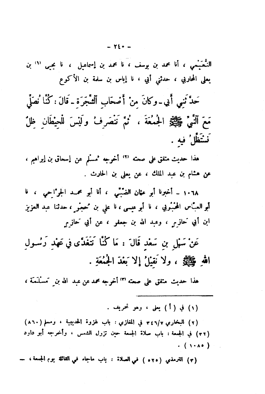 النُّعَيْمِيُّ، أَنا مُحَمَّدُ بْنُ يُوسُفَ، نَا مُحَمَّدُ بْنُ إِسْمَاعِيلَ، نَا يَحْيَى بْنُ يَعْلَى الْمُحَارِبِيُّ، حَدَّثَنِي أَبِي، نَا إِيَاسُ بْنُ سَلَمَةَ بْنِ الأَكْوَعِ، حَدَّثَنِي أَبِي، وَكَانَ مِنْ أَصْحَابِ الشَّجَرَةِ، قَالَ: «كُنَّا نُصَلِّي مَعَ النَّبِيِّ صَلَّى اللهُ عَلَيْهِ وَسَلَّمَ الْجُمُعَةَ، ثُمَّ نَنْصَرِفُ وَلَيْسَ لِلْحِيطَانِ ظِلٌّ نَسْتَظِلُّ فِيهِ».