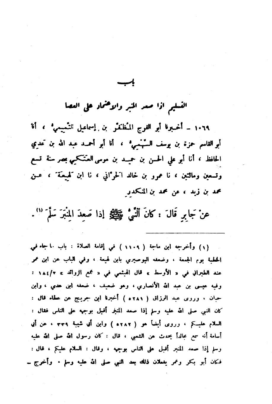 1069 - أَخْبَرَنَا أَبُو الْفَرَجِ الْمُظَفَّرُ بْنُ إِسْمَاعِيلَ التَّمِيمِيُّ، أَنا أَبُو الْقَاسِمِ حَمْزَةُ بْنُ يُوسُفَ السَّهْمِيُّ، أَنا أَبُو أَحْمَدَ عَبْدُ اللَّهِ بْنُ عَدِيٍّ الْحَافِظُ، أَنا أَبُو عَلِيٍّ الْحَسَنُ بْنُ حُمَيْدِ بْنِ مُوسَى الْعَتَكِيُّ، بِمِصْرَ سَنَةَ تِسْعٍ وَتِسْعِينَ وَمِائَتَيْنِ، نَا عَمْرُو بْنُ خَالِدٍ الْحَرَّانِيُّ، نَا ابْنُ لَهِيعَةَ، عَنْ مُحَمَّدِ بْنِ زَيْدٍ، عَنْ مُحَمَّدِ بْنِ الْمُنْكَدِرِ، عَنْ جَابِرٍ، قَالَ: «كَانَ النَّبِيُّ صَلَّى اللهُ عَلَيْهِ وَسَلَّمَ إِذَا صَعِدَ الْمِنْبَرَ سَلَّمَ»