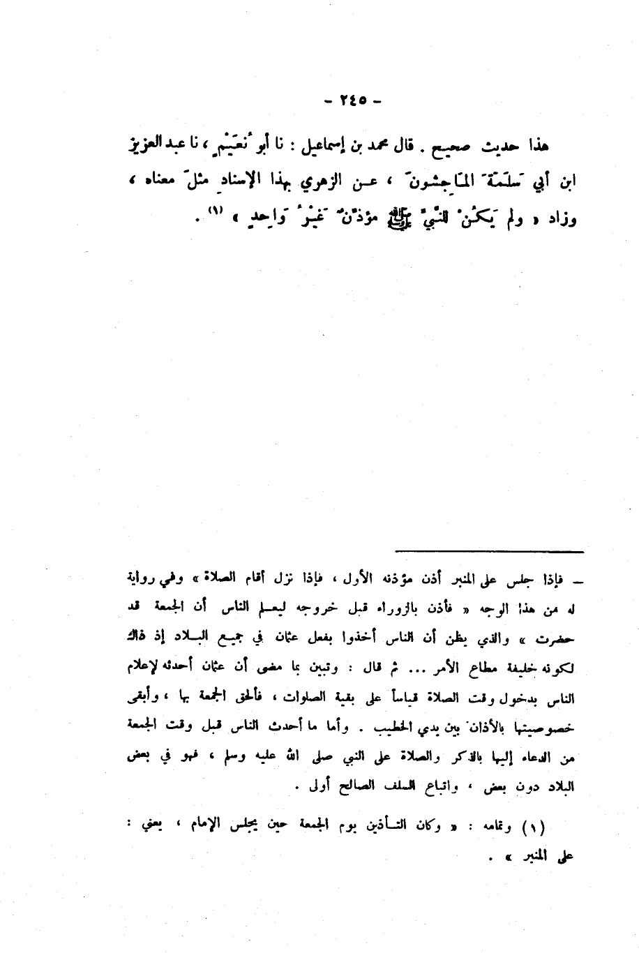 قَالَ مُحَمَّدُ بْنُ إِسْمَاعِيلَ: نَا أَبُو نُعَيْمٍ، نَا عَبْدُ الْعَزِيزِ بْنُ أَبِي سَلَمَةَ الْمَاجِشُونُ، عَنِ الزُّهْرِيِّ بِهَذَا الإِسْنَادِ مِثْلَ مَعْنَاهُ، «وَزَادَ وَلَمْ يَكُنْ لِلنَّبِيِّ مُؤَذِّنٌ غَيْرَ وَاحِدٍ»