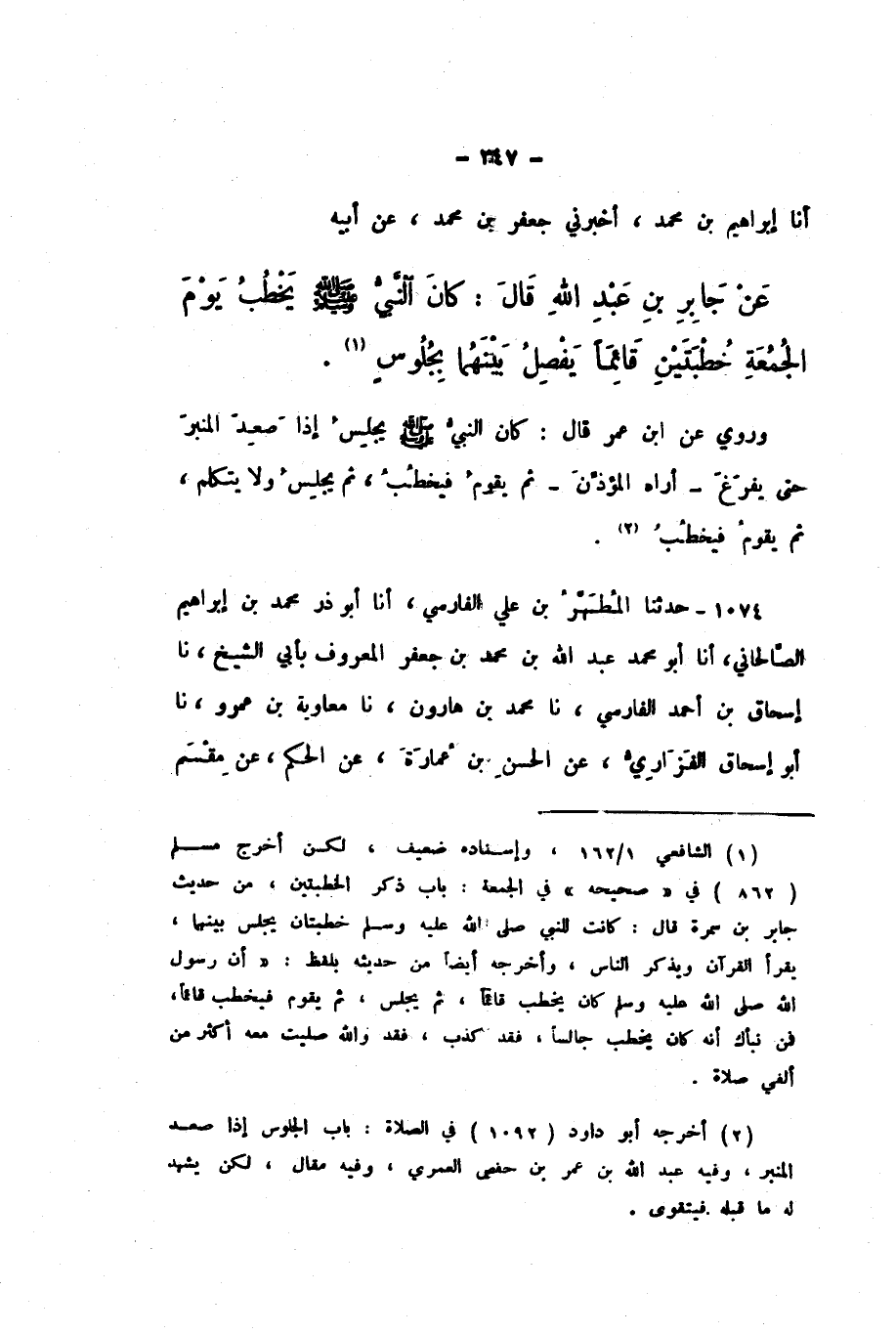 أَنا إِبْرَاهِيمُ بْنُ مُحَمَّدٍ، أَخْبَرَنِي جَعْفَرُ بْنُ مُحَمَّدٍ، عَنْ أَبِيهِ، عَنْ جَابِرِ بْنِ عَبْدِ اللَّهِ، قَالَ: «كَانَ النَّبِيُّ صَلَّى اللهُ عَلَيْهِ وَسَلَّمَ يَخْطُبُ يَوْمَ الْجُمُعَةِ خُطْبَتَيْنِ قَائِمًا يَفْصِلُ بَيْنَهُمَا بِجُلُوسٍ».