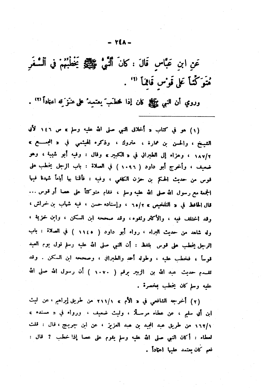 عَنِ ابْنِ عَبَّاسٍ، قَالَ: «كَانَ النَّبِيُّ صَلَّى اللهُ عَلَيْهِ وَسَلَّمَ يَخْطُبُهُمْ فِي السَّفَرِ مُتَوَكِّئًا عَلَى قَوْسٍ قَائِمًا».