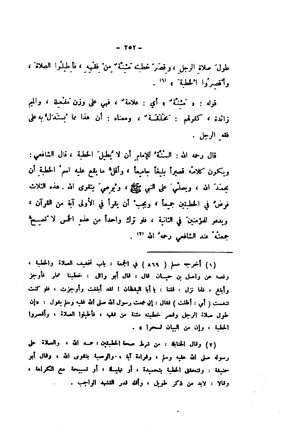 قَالَ رَحِمَهُ اللَّهُ: السُّنَّةُ لِلإِمَامِ أَنْ لَا يُطِيلَ الْخُطْبَةَ، قَالَ الشَّافِعِيُّ: وَيَكُونُ كَلامُهُ قَصِيرًا بَلِيغًا جَامِعًا، وَأَقَلُّ مَا يَقَعُ عَلَيْهِ اسْمُ الْخُطْبَةِ أَنْ يَحْمَدَ اللَّهَ، وَيُصَلِّيَ عَلَى النَّبِيِّ صَلَّى اللهُ عَلَيْهِ وَسَلَّمَ، وَيُوصِيَ بِتَقْوَى اللَّهِ.