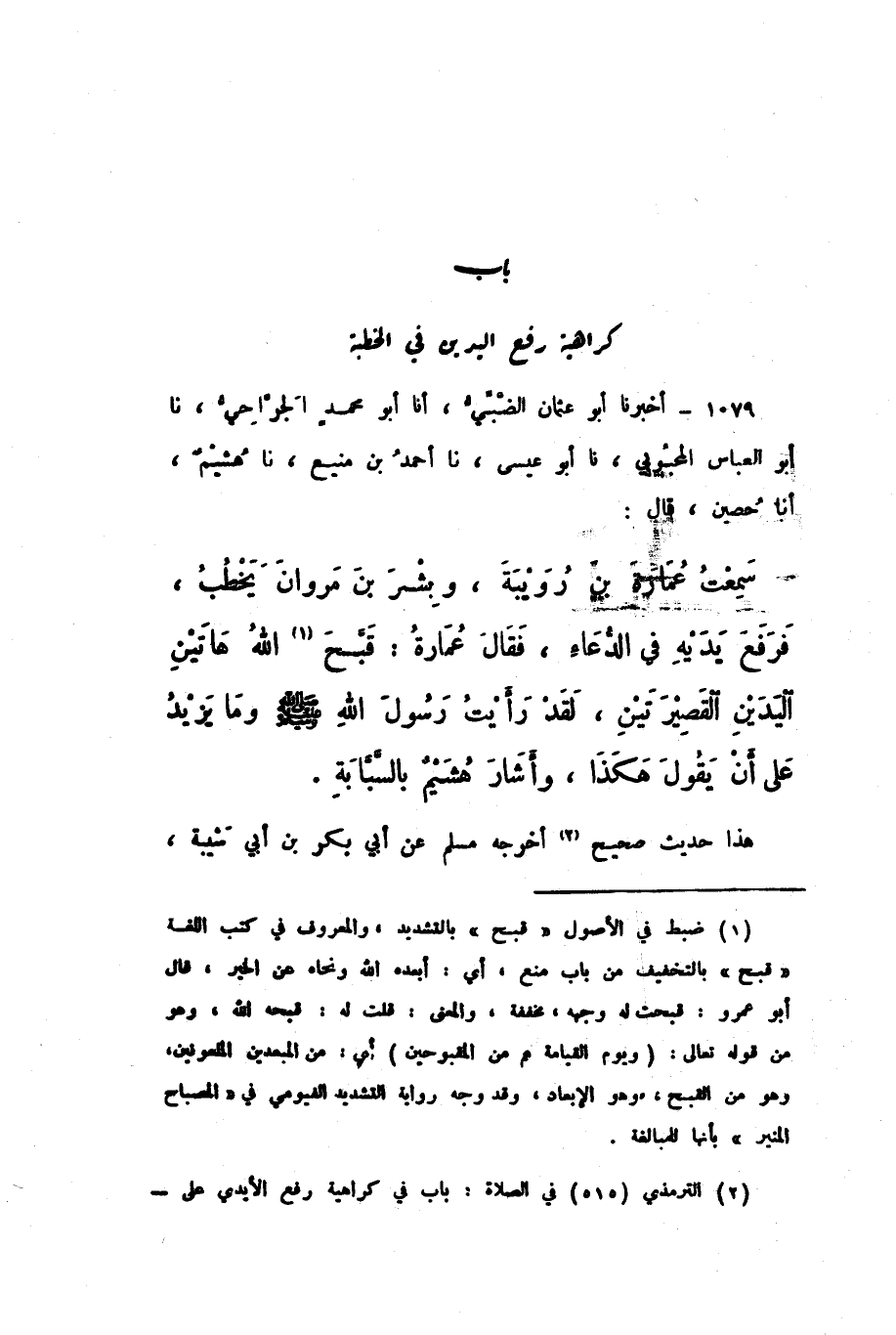 1079 - أَخْبَرَنَا أَبُو عُثْمَانَ الضَّبِّيُّ، أَنا أَبُو مُحَمَّدٍ الْجَرَّاحِيُّ، نَا أَبُو الْعَبَّاسِ الْمَحْبُوبِيُّ، نَا أَبُو عِيسَى، نَا أَحْمَدُ بْنُ مَنِيعٍ، نَا هُشَيْمٌ، أَنا حُصَيْنٌ، قَالَ: سَمِعْتُ عُمَارَةَ بْنَ رُوَيْبَةَ، وَبِشْرَ بْنَ مَرْوَانَ يَخْطُبُ فَرَفَعَ يَدَيْهِ فِي الدُّعَاءِ، فَقَالَ عُمَارَةُ: «قَبَّحَ اللَّهُ هَاتَيْنِ الْيَدَيْنِ الْقَصِيرَتَيْنِ، لَقَدْ رَأَيْتُ رَسُولَ اللَّهِ صَلَّى اللهُ عَلَيْهِ وَسَلَّمَ وَمَا يَزِيدُ عَلَى أَنْ يَقُولَ هَكَذَا، وَأَشَارَ هُشَيْمٌ بِالسَّبَّابَةِ».