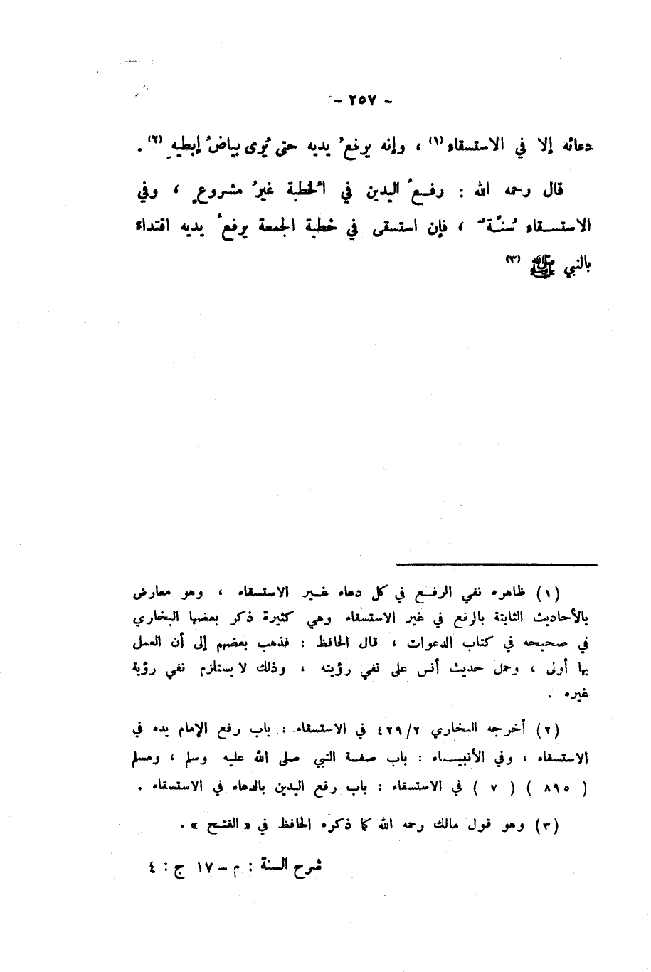 دُعَائِهِ إِلا فِي الاسْتِسْقَاءِ، وَإِنَّهُ يَرْفَعُ يَدَيْهِ حَتَّى يُرَى بَيَاضُ إِبِطَيْهِ» قَالَ رَحِمَهُ اللَّهُ: رَفْعُ الْيَدَيْنِ فِي الْخُطْبَةِ غَيْرُ مَشْرُوعٍ، وَفِي الاسْتِسْقَاءِ سُنَّةٌ، فَإِنِ اسْتَسْقَى فِي خُطْبَةِ الْجُمُعَةِ يَرْفَعُ يَدَيْهِ اقْتِدَاءً بِالنَّبِيِّ صَلَّى اللهُ عَلَيْهِ وَسَلَّمَ