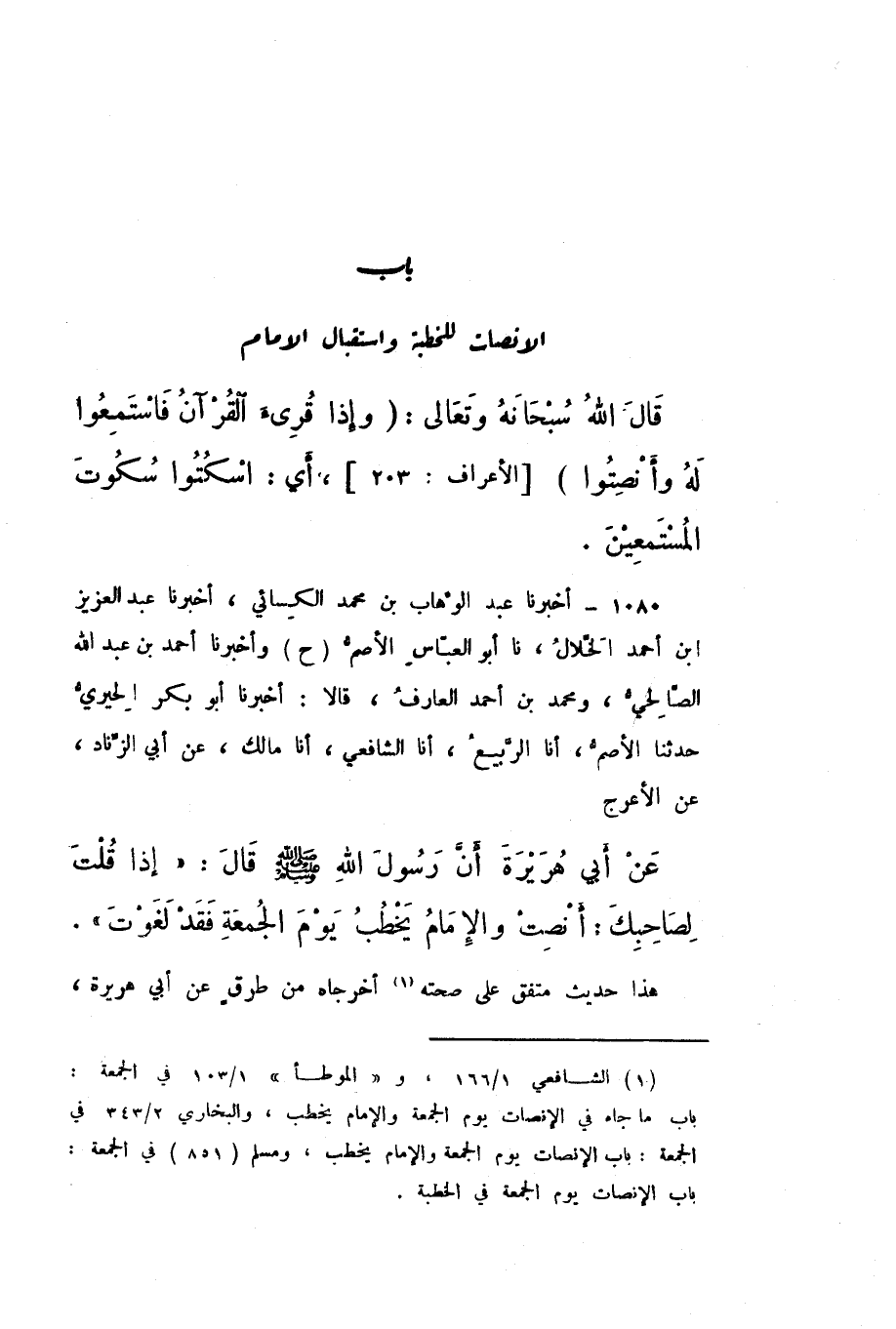 ح وَأَخْبَرَنَا أَحْمَدُ بْنُ عَبْدِ اللَّهِ الصَّالِحِيُّ، وَمُحَمَّدُ بْنُ أَحْمَدَ الْعَارِفُ، قَالا: أَخْبَرَنَا أَبُو بَكْرٍ الْحِيرِيُّ، حَدَّثَنَا الأَصَمُّ، أَنا الرَّبِيعُ، أَنا الشَّافِعِيُّ، أَنا مَالِكٌ، عَنْ أَبِي الزِّنَادِ، عَنِ الأَعْرَجِ، عَنْ أَبِي هُرَيْرَةَ، أَنَّ رَسُولَ اللَّهِ صَلَّى اللهُ عَلَيْهِ وَسَلَّمَ، قَالَ: " إِذَا قُلْتَ لِصَاحِبِكَ: أَنْصِتْ وَالإِمَامُ يَخْطُبُ يَوْمَ الْجُمُعَةِ فَقَدْ لَغَوْتَ ".