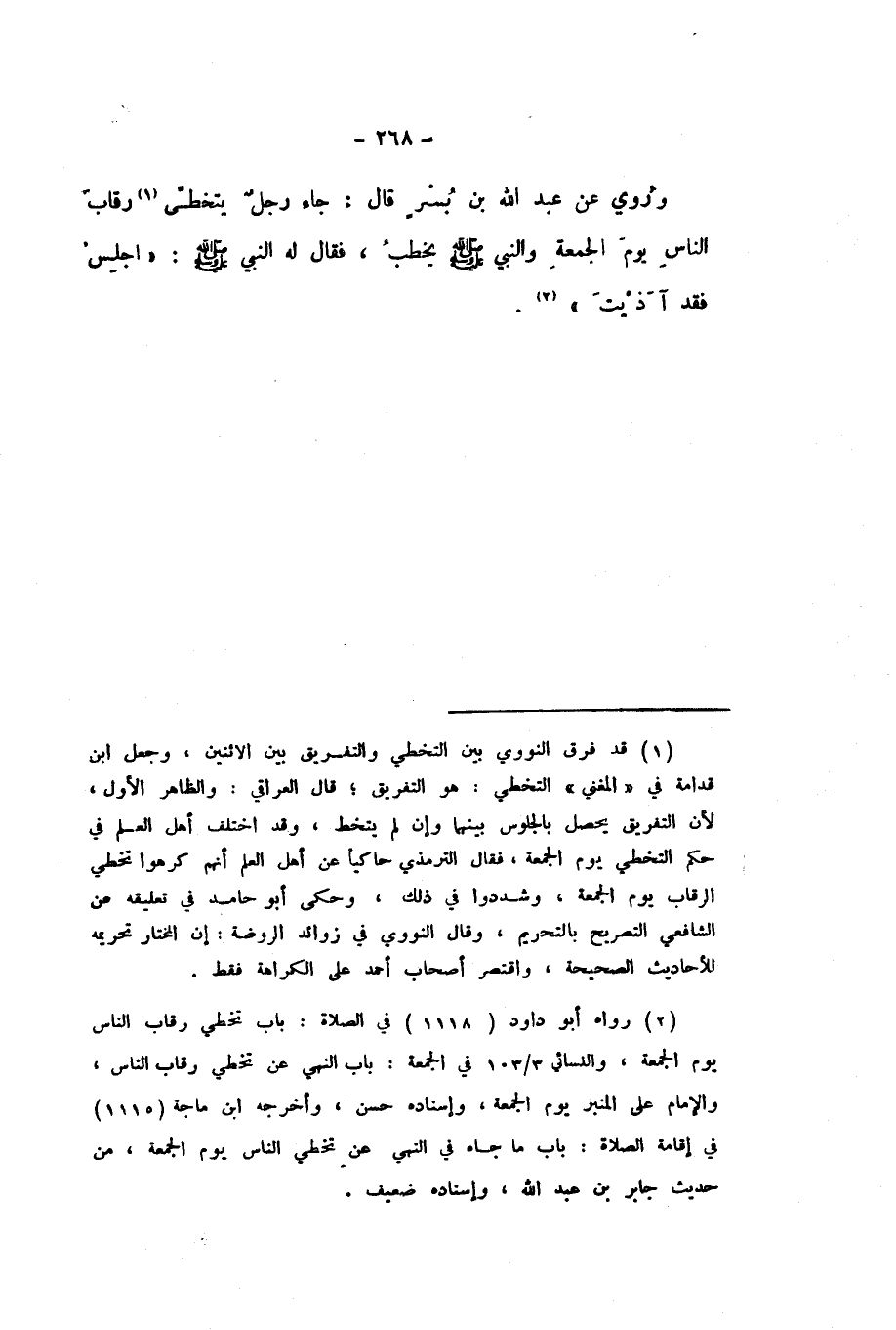 وَرُوِيَ عَنْ عَبْدِ اللَّهِ بْنِ بُسْرٍ، قَالَ: جَاءَ رَجُلٌ يَتَخَطَّى رِقَابَ النَّاسِ يَوْمَ الْجُمُعَةِ، وَالنَّبِيُّ صَلَّى اللهُ عَلَيْهِ وَسَلَّمَ يَخْطُبُ، فَقَالَ لَهُ النَّبِيُّ صَلَّى اللهُ عَلَيْهِ وَسَلَّمَ: «اجْلِسْ فَقَدْ آذَيْتَ»