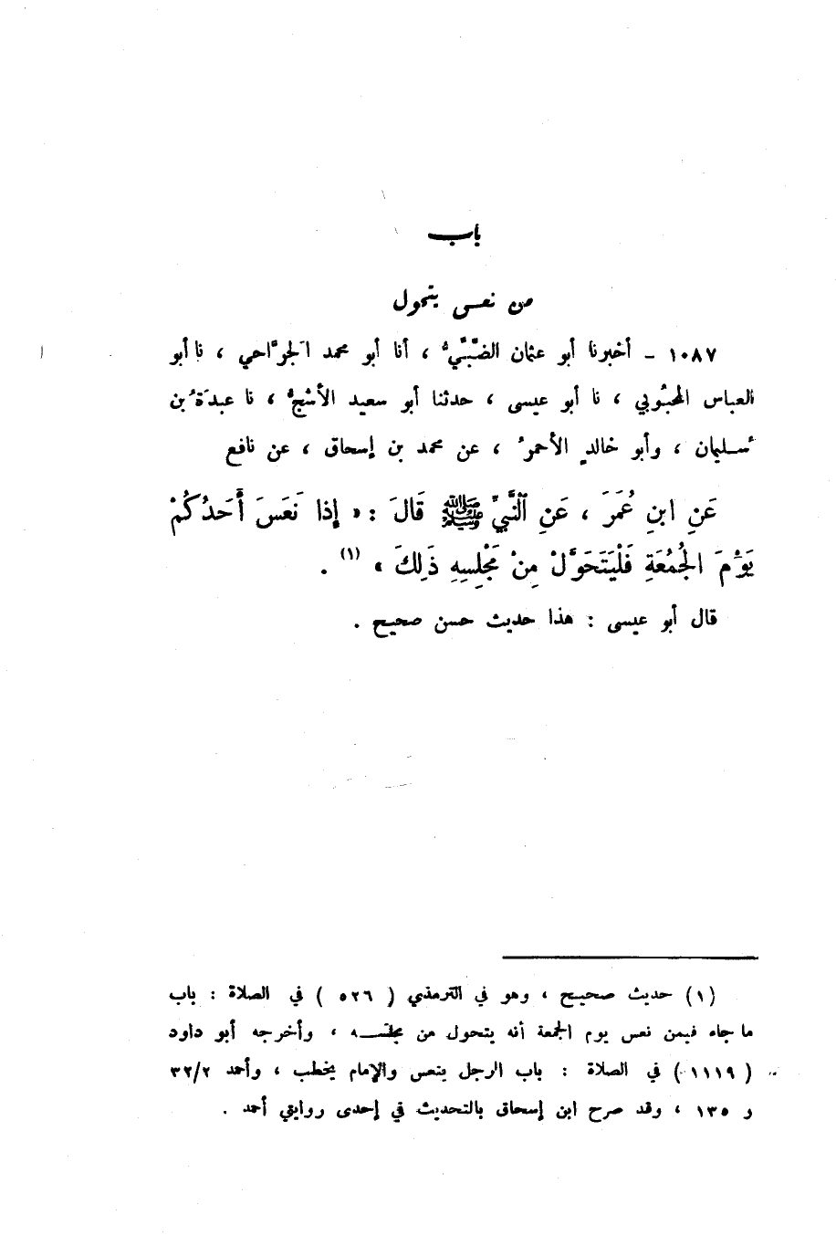 1087 - أَخْبَرَنَا أَبُو عُثْمَانَ الضَّبِّيُّ، أَنا أَبُو مُحَمَّدٍ الْجَرَّاحِيُّ، نَا أَبُو الْعَبَّاسِ الْمَحْبُوبِيُّ، نَا أَبُو عِيسَى، حَدَّثَنَا أَبُو سَعِيدٍ الأَشَجُّ، نَا عَبْدَةُ بْنُ سُلَيْمَانَ، وَأَبُو خَالِدٍ الأَحْمَرُ، عَنْ مُحَمَّدِ بْنِ إِسْحَاقَ، عَنْ نَافِعٍ، عَنِ ابْنِ عُمَرَ، عَنِ النَّبِيِّ صَلَّى اللهُ عَلَيْهِ وَسَلَّمَ، قَالَ: «إِذَا نَعَسَ أَحَدُكُمْ يَوْمَ الْجُمُعَةِ فَلْيَتَحَوَّلْ مِنْ مَجْلِسِهِ ذَلِكَ».