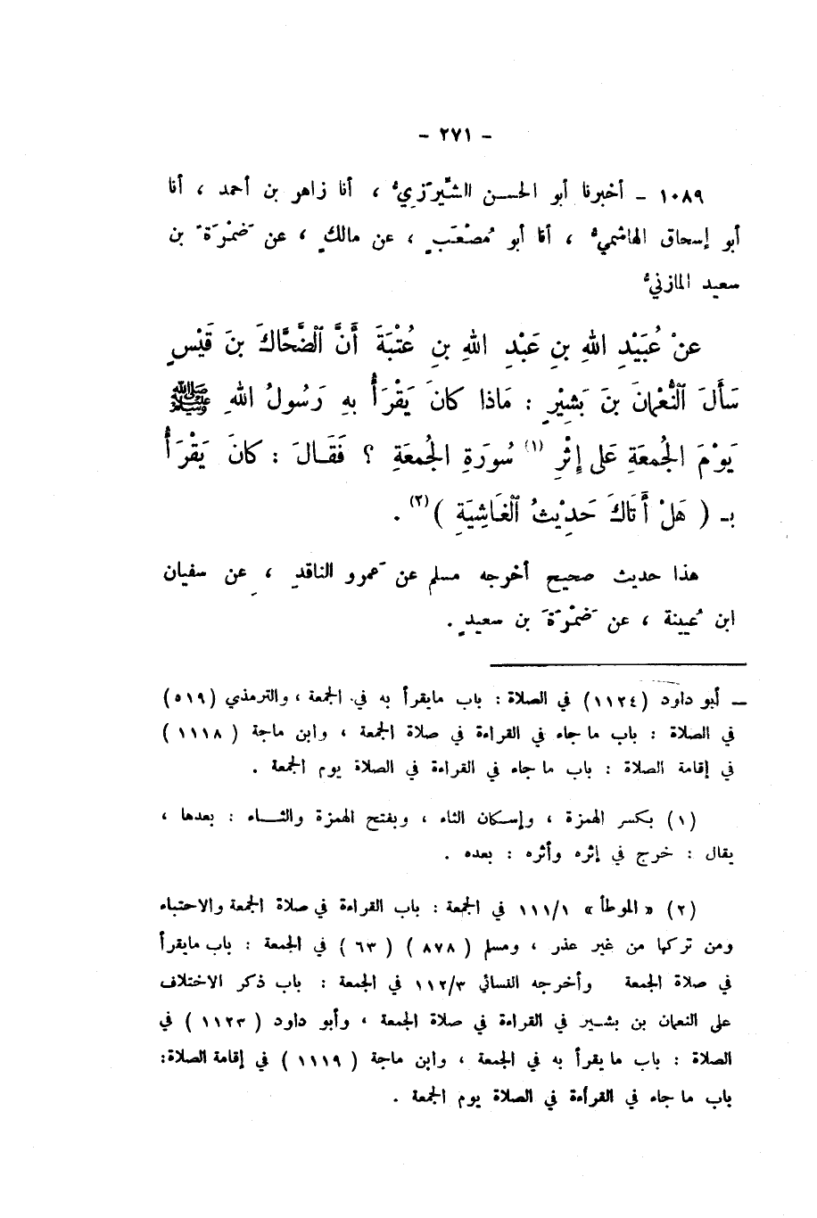 1089 - أَخْبَرَنَا أَبُو الْحَسَنِ الشِّيرَزِيُّ، أَنا زَاهِرُ بْنُ أَحْمَدَ، أَنا أَبُو إِسْحَاقَ الْهَاشِمِيُّ، أَنا أَبُو مُصْعَبٍ، عَنْ مَالِكٍ، عَنْ ضَمْرَةَ بْنِ سَعِيدٍ الْمَازِنِيِّ، عَنْ عُبَيْدِ اللَّهِ بْنِ عَبْدِ اللَّهِ بْنِ عُتْبَةَ، أَنَّ الضَّحَاكَ بْنَ قَيْسٍ، سَأَلَ النُّعْمَانَ بْنَ بَشِيرٍ: مَاذَا كَانَ يَقْرَأُ بِهِ رَسُولُ اللَّهِ صَلَّى اللهُ عَلَيْهِ وَسَلَّمَ يَوْمَ الْجُمُعَةِ عَلَى إِثْرِ سُورَةِ الْجُمُعَةِ؟ فَقَالَ: «كَانَ يَقْرَأُ بِـ هَلْ أَتَاكَ حَدِيثُ الْغَاشِيَةِ».