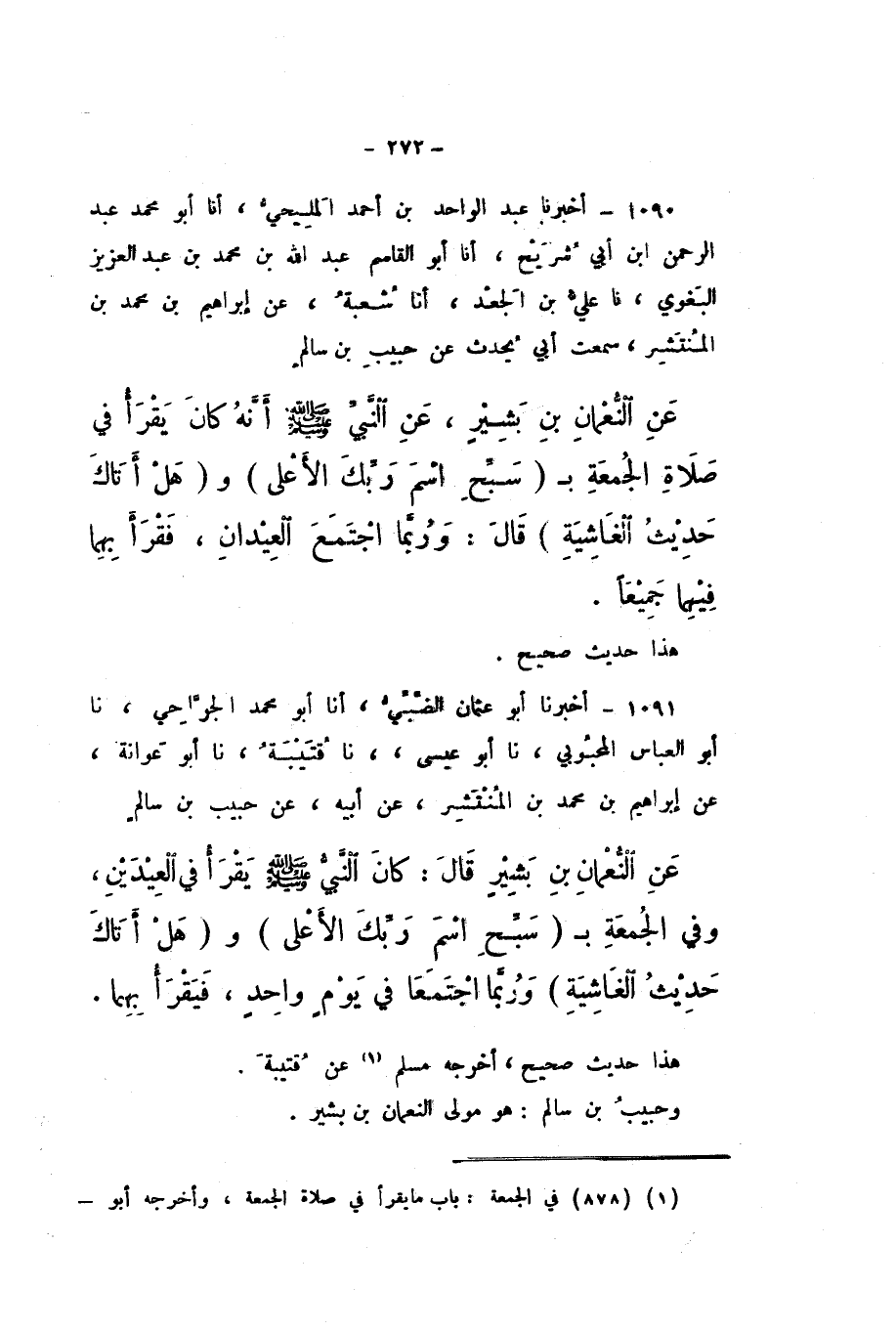 1091 - أَخْبَرَنَا أَبُو عُثْمَانَ الضَّبِّيُّ، أَنا أَبُو مُحَمَّدٍ الْجَرَّاحِيُّ، نَا أَبُو الْعَبَّاسِ الْمَحْبُوبِيُّ، نَا أَبُو عِيسَى، نَا قُتَيْبَةُ، نَا أَبُو عَوَانَةَ، عَنْ إِبْرَاهِيمَ بْنِ مُحَمَّدِ بْنِ الْمُنْتَشِرِ، عَنْ أَبِيهِ، عَنْ حَبِيبِ بْنِ سَالِمٍ، عَنِ النُّعْمَانِ بْنِ بَشِيرٍ، قَالَ: «كَانَ النَّبِيُّ صَلَّى اللهُ عَلَيْهِ وَسَلَّمَ يَقْرَأُ فِي الْعِيدَيْنِ، وَفِي الْجُمُعَةِ بِـ سَبِّحِ اسْمَ رَبِّكَ الأَعْلَى وَهَلْ أَتَاكَ حَدِيثُ الْغَاشِيَةِ وَرُبَّمَا اجْتَمَعَا فِي يَوْمٍ وَاحِدٍ، فَيَقْرَأُ بِهِمَا».