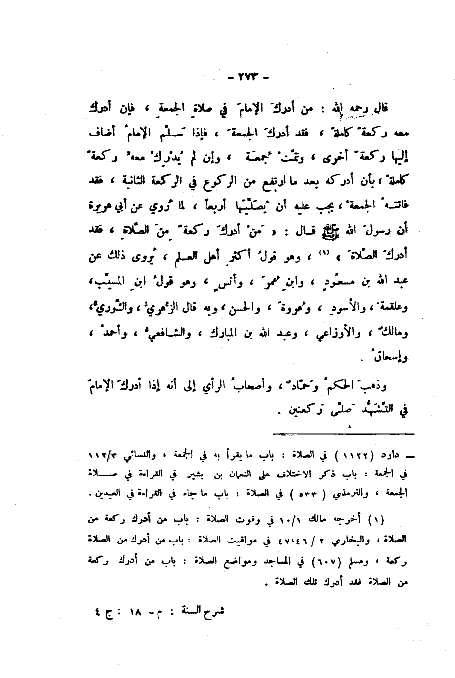قَالَ رَحِمَهُ اللَّهُ: مَنْ أَدْرَكَ الإِمَامَ فِي صَلاةِ الْجُمُعَةِ، فَإِنْ أَدْرَكَ مَعَهُ رَكْعَةً كَامِلَةً، فَقَدْ أَدْرَكَ الْجُمُعَةَ، فَإِذَا سَلَّمَ الإِمَامُ أَضَافَ إِلَيْهَا رَكْعَةً أُخْرَى، وَتَمَّتْ جُمُعَةٌ، وَإِنْ لَمْ يُدْرِكْ مَعَهُ رَكْعَةً كَامِلَةً، بِأَنْ أَدْرَكَهُ بَعْدَ مَا ارْتَفَعَ مِنَ الرُّكُوعِ فِي الرَّكْعَةِ الثَّانِيَةِ، فَقَدْ فَاتَتْهُ الْجُمُعَةُ، يَجِبُ عَلَيْهِ أَنْ يُصَلِّيَهَا أَرْبَعًا، لِمَا رُوِيَ عَنْ أَبِي هُرَيْرَةَ، أَنَّ رَسُولَ اللَّهِ صَلَّى اللهُ عَلَيْهِ وَسَلَّمَ قَالَ: «مَنْ أَدْرَكَ رَكْعَةً مِنَ الصَّلاةِ، فَقَدْ أَدْرَكَ الصَّلاةَ».