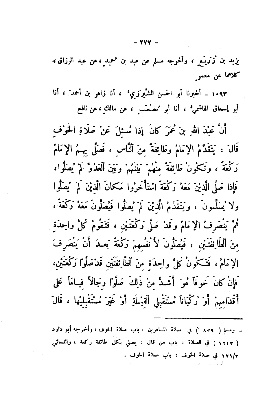 1093 - أَخْبَرَنَا أَبُو الْحَسَنِ الشِّيرَزِيُّ، أَنا زَاهِرُ بْنُ أَحْمَدَ، أَنا أَبُو إِسْحَاقَ الْهَاشِمِيُّ، أَنا أَبُو مُصْعَبٍ، عَنْ مَالِكٍ، عَنْ نَافِعٍ، أَنَّ عَبْدَ اللَّهِ بْنَ عُمَرَ، كَانَ إِذَا سُئِلَ عَنْ صَلاةِ الْخَوْفِ، قَالَ: «يَتَقَدَّمُ الإمَامُ وَطَائِفَةٌ مِنَ النَّاسِ، فَصَلَّى بِهِمُ الإِمَامُ رَكْعَةً، وَتَكُونَ طَائِفَةٌ مِنْهُمْ بَيْنَهُمْ وَبَيْنَ الْعَدُوِّ لَمْ يُصَلُّوا، فَإِذَا صَلَّى الَّذِينَ مَعَهُ رَكْعَةً اسْتَأْخَرُوا مَكَانَ الَّذِينَ لَمْ يُصَلُّوا وَلا يُسَلِّمُونَ، وَيَتَقَدَّمُ الَّذِينَ لَمْ يُصَلُّوا فَيُصَلُّونَ مَعَهُ رَكْعَةً، ثُمَّ يَنْصَرِفُ الإِمَامُ، وَقَدْ صَلَّى رَكْعَتَيْنِ، فَتَقُومُ كُلُّ وَاحِدَةٍ مِنَ الطَّائِفَتَيْنِ، فَيُصَلُّونَ لأَنْفُسِهِمْ رَكْعَةً بَعْدَ أَنْ يَنْصَرِفَ الإِمَامُ، فَتَكُونُ كُلُّ وَاحِدَةٍ مِنَ الطَّائِفَتَيْنِ قَدْ صَلَّوْا رَكْعَتَيْنِ، فَإِنْ كَانَ خَوْفًا هُوَ أَشَدَّ مِنْ ذَلِكَ صَلَّوْا رِجَالا قِيَامًا عَلَى أَقْدَامِهِمْ أَوْ رُكْبَانًا مُسْتَقْبِلِي الْقِبْلَةِ، أَوْ غَيْرَ مُسْتَقْبِلِيهَا»، قَالَ
