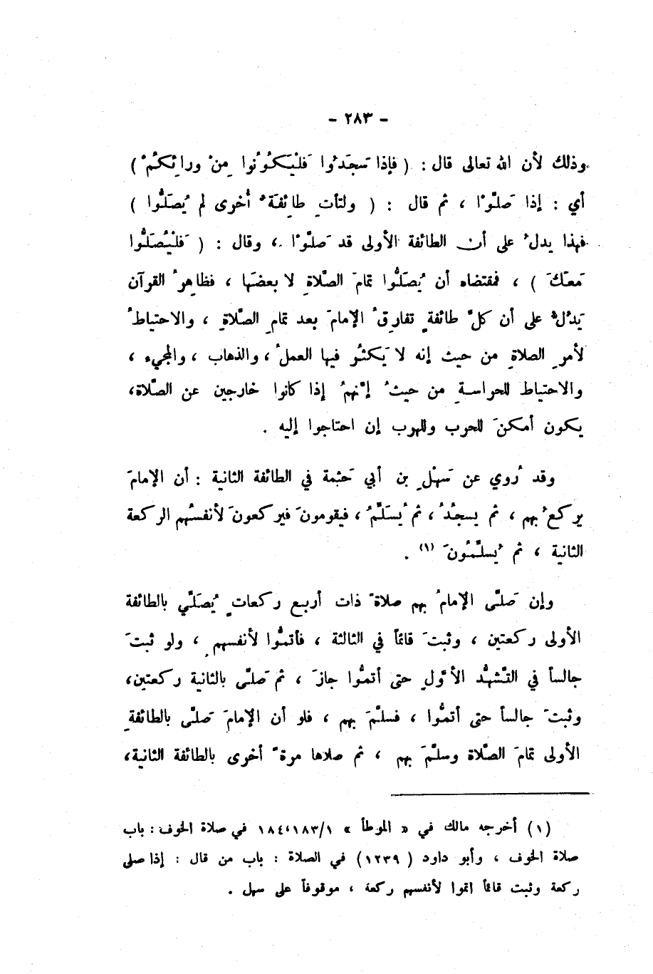 وَذَلِكَ لأَنَّ اللَّهَ تَعَالَى، قَالَ: {فَإِذَا سَجَدُوا فَلْيَكُونُوا مِنْ وَرَائِكُمْ} [النِّسَاء: 102] أَيْ: إِذَا صَلَّوْا، ثُمَّ قَالَ: {وَلْتَأْتِ طَائِفَةٌ أُخْرَى لَمْ يُصَلُّوا} [النِّسَاء: 102] فَهَذَا يَدُلُّ عَلَى أَنَّ الطَّائِفَةَ الأُولَى قَدْ صَلَّوْا، وَقَالَ: {فَلْيُصَلُّوا مَعَكَ} [النِّسَاء: 102]، فَمُقْتَضَاهُ أَنْ يُصَلُّوا تَمَامَ الصَّلاةِ لَا بَعْضَهَا، فَظَاهِرُ الْقُرْآنِ يَدُلُّ عَلَى أَنَّ كُلَّ طَائِفَةٍ تُفَارِقُ الإِمَامَ بَعْدَ تَمَامِ الصَّلاةِ، وَالاحْتِيَاطُ لأَمْرِ الصَّلاةِ مِنْ حَيْثُ إِنَّهُ لَا يَكْثُرُ فِيهَا الْعَمَلُ، وَالذِّهَابُ، وَالْمَجِيءُ، وَالاحْتِيَاطُ لِلْحِرَاسَةِ مِنْ حَيْثُ إِنَّهُمْ إِذَا كَانُوا خَارِجِينَ عَنِ الصَّلاةِ، يَكُونُ أَمْكَنَ لِلْحَرْبِ، وَلِلْهَرَبِ إِنِ احْتَاجُوا إِلَيْهِ.