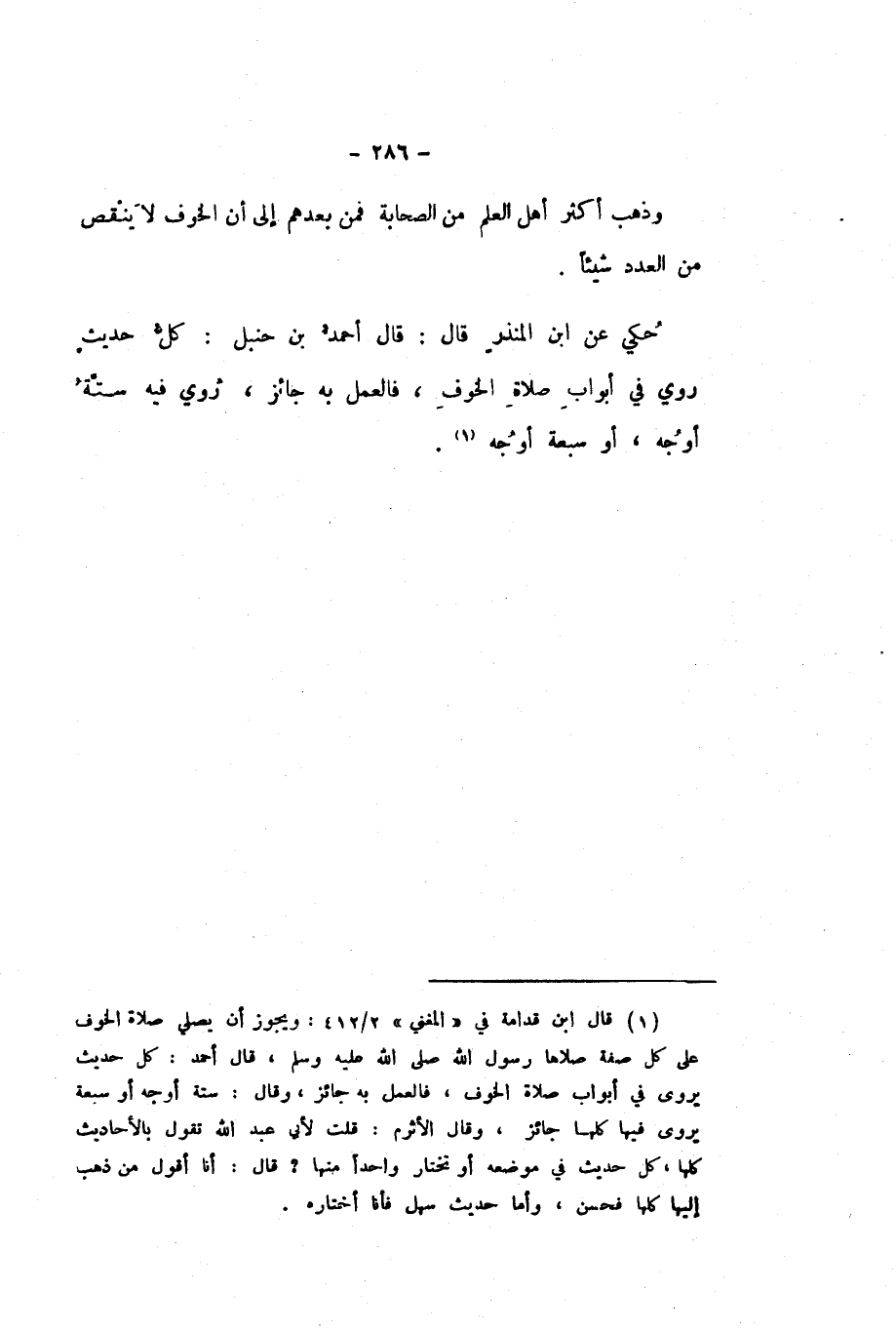 حُكِيَ عَنِ ابْنِ الْمُنْذِرِ، قَالَ: قَالَ أَحْمَدُ بْنُ حَنْبَلٍ: كُلُّ حَدِيثٍ رُوِيَ فِي أَبْوَابِ صَلاةِ الْخَوْفِ، فَالْعَمَلُ بِهِ جَائِزٌ، رُوِيَ فِيهِ سِتَّةُ أَوْجُهٍ، أَوْ سَبْعَةُ أَوْجُهٍ