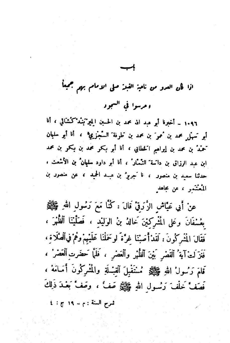1096 - أَخْبَرَنَا أَبُو عَبْدِ اللَّهِ مُحَمَّدُ بْنُ الْحُسَيْنِ الْمِيرَبَنْدَكُشَائِيُّ , أَنا أَبُو سَهْلٍ مُحَمَّدُ بْنُ عُمَرَ بْنِ مُحَمَّدِ بْنِ طَرَفَةَ السِّجْزِيُّ، أَنا أَبُو سُلَيْمَانَ حَمْدُ بْنُ مُحَمَّدِ بْنِ إِبْرَاهِيمَ الْخَطَّابِيُّ، أَنا أَبُو بَكْرٍ مُحَمَّدُ بْنُ بَكْرِ بْنِ مُحَمَّدِ بْنِ عَبْدِ الرَّزَّاقِ بْنِ دَاسَةَ التَّمَّارُ، أَنا أَبُو دَاوُدَ سُلَيْمَانُ بْنُ الأَشْعَثِ، حَدَّثَنَا سَعِيدُ بْنُ مَنْصُورٍ، نَا جَرِيرُ بْنُ عَبْدِ الْحَمِيدِ، عَنْ مَنْصُورِ بْنِ الْمُعْتَمِرِ، عَنْ مُجَاهِدٍ، عَنْ أَبِي عَيَّاشٍ الزُّرَقِيِّ، قَالَ: " كُنَّا مَعَ رَسُولِ اللَّهِ صَلَّى اللهُ عَلَيْهِ وَسَلَّمَ بِعُسْفَانَ , وَعَلَى الْمُشْرِكِينَ خَالِدُ بْنُ الْوَلِيدِ، فَصَلَّيْنَا الظُّهْرَ، فَقَالَ الْمُشْرِكُونَ: لَقَدْ أَصَبْنَا غِرَّةً لَوْ حَمَلْنَا عَلَيْهِمْ وَهُمْ فِي الصَّلاةِ، فَنَزَلَتْ آيَةُ الْقَصْرِ بَيْنَ الظُّهْرِ وَالْعَصْرِ، فَلَمَّا حَضَرَتِ الْعَصْرُ، قَامَ رَسُولُ اللَّهِ صَلَّى اللهُ عَلَيْهِ وَسَلَّمَ مُسْتَقْبِلَ الْقِبْلَةِ وَالْمُشْرِكُونَ أَمَامَهُ، فَصَفَّ خَلْفَ رَسُولِ اللَّهِ صَلَّى اللهُ عَلَيْهِ وَسَلَّمَ صَفٌّ، وَصَفَّ بَعْدَ ذَلِكَ