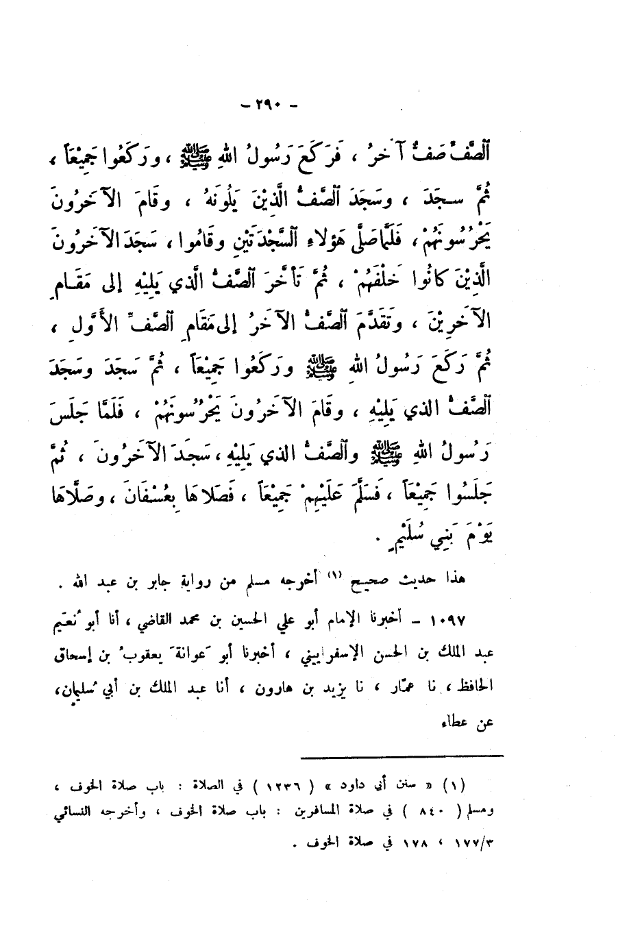 الصَّفِّ صَفٌّ آخَرُ، فَرَكَعَ رَسُولُ اللَّهِ صَلَّى اللهُ عَلَيْهِ وَسَلَّمَ، وَرَكَعُوا جَمِيعًا، ثُمَّ سَجَدَ، وَسَجَدَ الصَّفُّ الَّذِينَ يَلُونَهُ، وَقَامَ الآخَرُونَ يَحْرُسُونَهُمْ، فَلَمَّا صَلَّى هَؤُلاءِ السَّجْدَتَيْنِ وَقَامُوا، سَجَدَ الآخَرُونَ الَّذِينَ كَانُوا خَلْفَهُمْ، ثُمَّ تَأَخَّرَ الصَّفُّ الَّذِي يَلِيهِ إِلَى مَقَامِ الآخَرِينَ، وَتَقَدَّمَ الصَّفُّ الآخَرُ إِلَى مَقَامِ الصَّفِّ الأَوَّلِ، ثُمَّ رَكَعَ رَسُولُ اللَّهِ صَلَّى اللهُ عَلَيْهِ وَسَلَّمَ وَرَكَعُوا جَمِيعًا، ثُمَّ سَجَدَ وَسَجَدَ الصَّفُّ الَّذِي يَلِيهِ، وَقَامَ الآخَرُونَ يَحْرُسُونَهُمْ، فَلَمَّا جَلَسَ رَسُولُ اللَّهِ صَلَّى اللهُ عَلَيْهِ وَسَلَّمَ وَالصَّفُّ الَّذِي يَلِيهِ، سَجَدَ الآخَرُونَ، ثُمَّ جَلَسُوا جَمِيعًا، فَسَلَّمَ عَلَيْهِمْ جَمِيعًا، فَصَلاهَا بِعُسْفَانَ، وَصَلاهَا يَوْمَ بَنِي سُلَيْمٍ ".