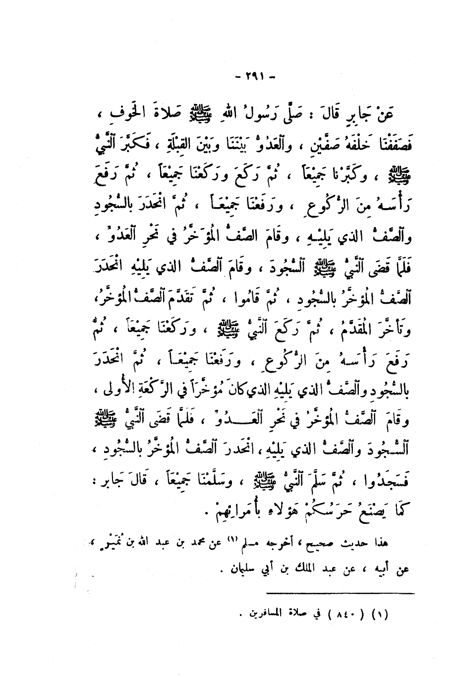 عَنْ جَابِرٍ، قَالَ: «صَلَّى رَسُولُ اللَّهِ صَلَّى اللهُ عَلَيْهِ وَسَلَّمَ صَلاةَ الْخَوْفِ، فَصَفَفْنَا خَلْفَهُ صَفَّيْنِ، وَالْعَدُوُّ بَيْنَنَا وَبَيْنَ الْقِبْلَةِ، فَكَبَّرَ النَّبِيُّ صَلَّى اللهُ عَلَيْهِ وَسَلَّمَ، وَكَبَّرْنَا جَمِيعًا، ثُمَّ رَكَعَ وَرَكَعْنَا جَمِيعًا، ثُمَّ رَفَعَ رَأْسَهُ مِنَ الرُّكُوعِ، وَرَفَعْنَا جَمِيعًا، ثُمَّ انْحَدَرَ بِالسُّجُودِ وَالصَّفُّ الَّذِي يَلِيهِ، وَقَامَ الصَّفُّ الْمُؤَخَّرُ فِي نَحْرِ الْعَدُوِّ، فَلَمَّا قَضَى النَّبِيُّ صَلَّى اللهُ عَلَيْهِ وَسَلَّمَ السُّجُودَ، وَقَامَ الصَّفُّ الَّذِي يَلِيهِ انْحَدَرَ الصَّفُّ الْمُؤَخَّرُ بِالسُّجُودِ، ثُمَّ قَامُوا، ثُمَّ تَقَدَّمَ الصَّفُّ الْمُؤَخَّرُ، وَتَأَخَّرَ الْمُقَدَّمُ، ثُمَّ رَكَعَ النَّبِيُّ صَلَّى اللهُ عَلَيْهِ وَسَلَّمَ، وَرَكَعْنَا جَمِيعًا، ثُمَّ رَفَعَ رَأْسَهُ مِنَ الرُّكُوعِ، وَرَفَعْنَا جَمِيعًا، ثُمَّ انْحَدَرَ بِالسُّجُودِ وَالصَّفُّ الَّذِي يَلِيهِ الَّذِي كَانَ مُؤَخَّرًا فِي الرَّكْعَةِ الأُولَى، وَقَامَ الصَّفُّ الْمُؤَخَّرُ فِي نَحْرِ الْعَدُوِّ، فَلَمَّا قَضَى النَّبِيُّ صَلَّى اللهُ عَلَيْهِ وَسَلَّمَ السُّجُودَ، وَالصَّفُّ الَّذِي يَلِيهِ، انْحَدَرَ الصَّفُّ الْمُؤَخَّرُ بِالسُّجُودِ، فَسَجَدُوا، ثُمَّ سَلَّمَ النَّبِيُّ صَلَّى اللهُ عَلَيْهِ وَسَلَّمَ، وَسَلَّمْنَا جَمِيعًا»، قَالَ جَابِرٌ: كَمَا يَصْنَعُ حَرَسُكُمْ هَؤُلاءِ بِأُمَرَائِهِمْ ".