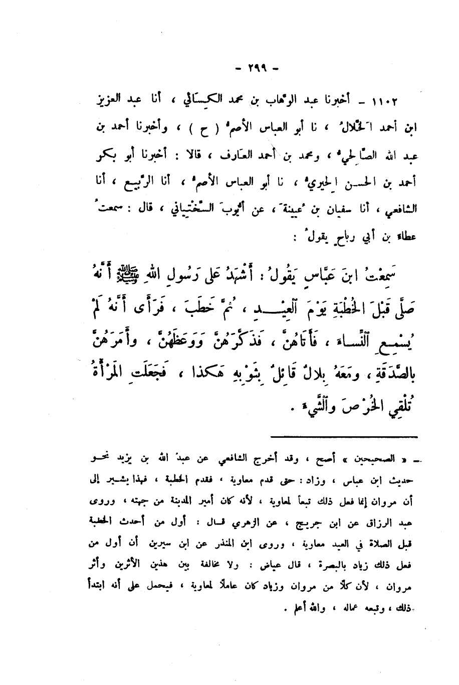 ح وَأَخْبَرَنَا أَحْمَدُ بْنُ عَبْدِ اللَّهِ الصَّالِحِيُّ، وَمُحَمَّدُ بْنُ أَحْمَدَ الْعَارِفُ، قَالا: أَخْبَرَنَا أَبُو بَكْرٍ أَحْمَدُ بْنُ الْحَسَنِ الْحِيرِيُّ، نَا أَبُو الْعَبَّاسِ الأَصَمُّ، أَنا الرَّبِيعُ، أَنا الشَّافِعِيُّ، أَنا سُفْيَانُ بْنُ عُيَيْنَةَ، عَنْ أَيُّوبَ السَّخْتِيَانِيِّ، قَالَ: سَمِعْتُ عَطَاءَ بْنَ أَبِي رَبَاحٍ، يَقُولُ: سَمِعْتُ ابْنَ عَبَّاسٍ، يَقُولُ: أَشْهَدُ عَلَى رَسُولِ اللَّهِ صَلَّى اللهُ عَلَيْهِ وَسَلَّمَ أَنَّهُ «صَلَّى قَبْلَ الْخُطْبَةِ يَوْمَ الْعِيدِ، ثُمَّ خَطَبَ، فَرَأَى أَنَّهُ لَمْ يُسْمِعِ النِّسَاءَ، فَأَتَاهُنَّ، فَذَكَّرَهُنَّ وَوَعَظَهُنَّ، وَأَمَرَهُنَّ بِالصَّدَقَةِ، وَمَعَهُ بِلالٌ، قَائِلٌ بِثَوْبِهِ هَكَذَا، فَجَعَلَتِ الْمَرْأَةُ تُلْقِي الخُرْصَ وَالشَّيْءَ».
