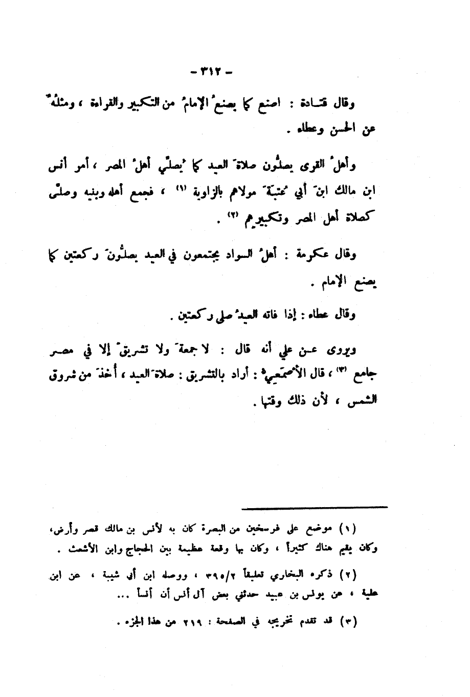 وَأَهْلُ الْقُرَى يُصَلُّونَ صَلاةَ الْعِيدِ كَمَا يُصَلِّي أَهْلُ الْمِصْرِ، أَمَرَ أَنَسُ بْنُ مَالِكٍ ابْنَ أَبِي عُتْبَةَ مَوْلاهُمْ بِالزَّاوِيَةِ، فَجَمَعَ أَهْلَهُ وَبَنِيهِ وَصَلَّى كَصَلاةِ أَهْلِ الْمِصْرِ وَتَكْبِيرِهِمْ.