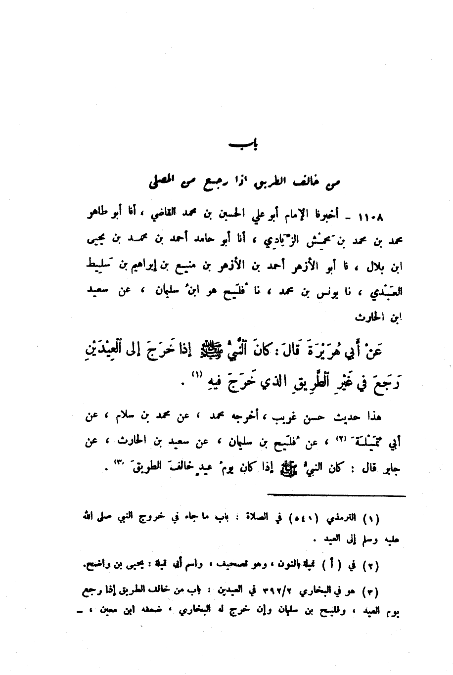1108 - أَخْبَرَنَا الإِمَامُ أَبُو عَلِيٍّ الْحُسَيْنُ بْنُ مُحَمَّدٍ الْقَاضِي، أَنا أَبُو طَاهِرٍ مُحَمَّدُ بْنُ مُحَمَّدِ بْنِ مَحْمِشٍ الزِّيَادِيُّ، أَنا أَبُو حَامِدٍ أَحْمَدُ بْنُ مُحَمَّدِ بْنِ يَحْيَى بْنِ بِلالٍ، نَا أَبُو الأَزْهَرِ أَحْمَدُ بْنُ الأَزْهَرِ بْنِ مَنِيعِ بْنِ إِبْرَاهِيمَ بْنِ سَلِيطٍ الْعَبْدِيُّ، نَا يُونُسُ بْنُ مُحَمَّدٍ، نَا فُلَيْحٌ، هُوَ ابْنُ سُلَيْمَانَ، عَنْ سَعِيدِ بْنِ الْحَارِثِ، عَنْ أَبِي هُرَيْرَةَ، قَالَ: «كَانَ النَّبِيُّ صَلَّى اللهُ عَلَيْهِ وَسَلَّمَ إِذَا خَرَجَ إِلَى الْعِيدَيْنِ رَجَعَ فِي غَيْرِ الطَّرِيقِ الَّذِي خَرَجَ فِيهِ».