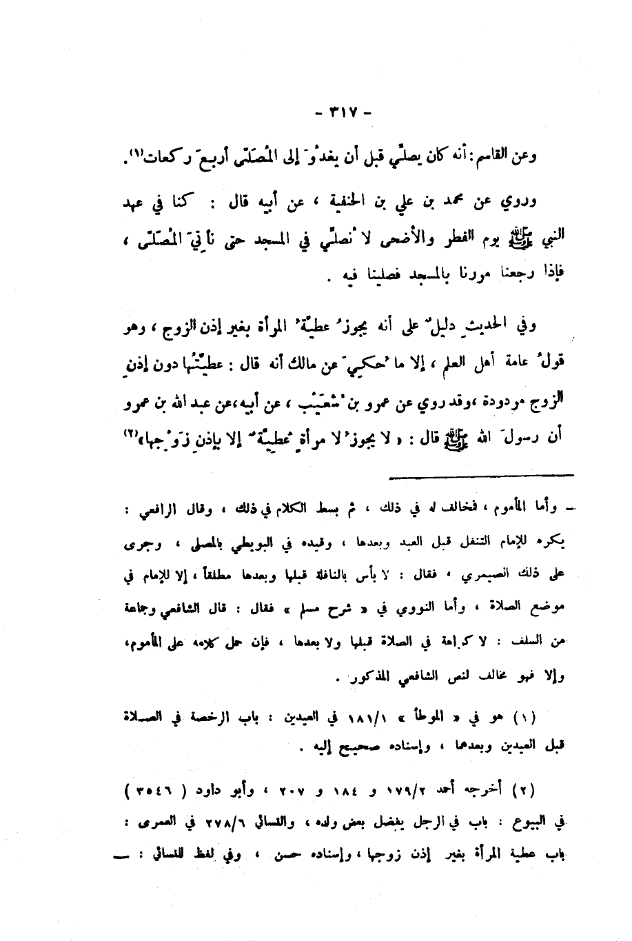 وَرُوِيَ عَنْ مُحَمَّدِ بْنِ عَلِيِّ بْنِ الْحَنَفِيَّةِ، عَنْ أَبِيهِ، قَالَ: كُنَّا فِي عَهْدِ النَّبِيِّ صَلَّى اللهُ عَلَيْهِ وَسَلَّمَ يَوْمَ الْفِطْرِ وَالأَضْحَى «لَا نُصَلِّي فِي الْمَسْجِدِ حَتَّى نَأْتِيَ الْمُصَلَّى، فَإِذَا رَجَعْنَا مَرَرْنَا بِالْمَسْجِدِ فَصَلَّيْنَا فِيهِ».