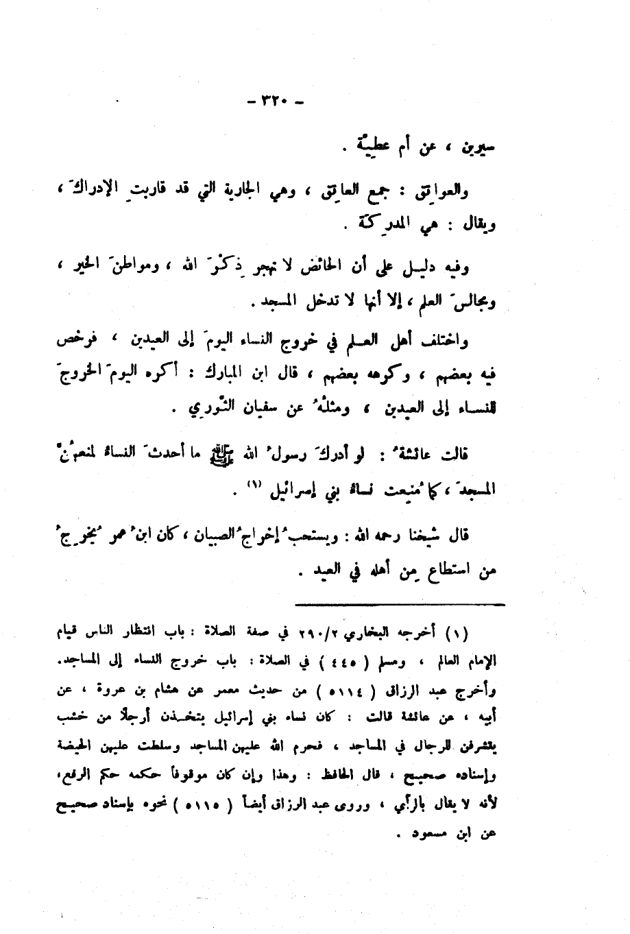 وَاخْتَلَفَ أَهْلُ الْعِلْمِ فِي خُرُوجِ النِّسَاءِ الْيَوْمَ إِلَى الْعِيدَيْنِ، فَرَخَّصَ فِيهِ بَعْضُهُمْ، وَكَرِهَهُ بَعْضُهُمْ، قَالَ ابْنُ الْمُبَارَكِ: أَكْرَهُ الْيَوْمَ الْخُرُوجَ لِلنِّسَاءِ إِلَى الْعِيدَيْنِ، وَمِثْلُهُ عَنْ سُفْيَانَ الثَّوْرِيِّ.