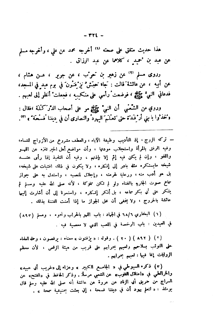 وَرَوَى مُسْلِمٌ، عَنْ زُهَيْرِ بْنِ حَرْبٍ، عَنْ جَرِيرٍ، عَنْ هِشَامٍ، عَنْ أَبِيهِ، عَنْ عَائِشَةَ، قَالَتْ: «جَاءَ حَبَشٌ يَزْفِنُونَ فِي يَوْمِ عِيدٍ فِي الْمَسْجِدِ، فَدَعَانِي النَّبِيُّ صَلَّى اللهُ عَلَيْهِ وَسَلَّمَ، فَوَضَعْتُ رَأْسِي عَلَى مَنْكِبِهِ، فَجَعَلْتُ أَنْظُرُ إِلَى لَعِبِهِمْ».