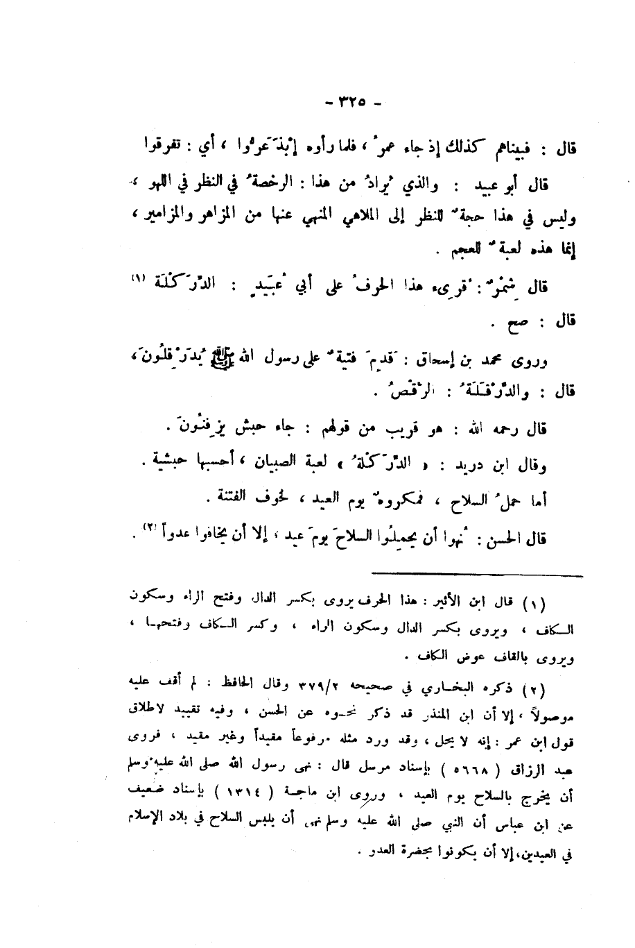 قَالَ أَبُو عُبَيْدٍ: وَالَّذِي يُرَادُ مِنْ هَذَا: الرُّخْصَةُ فِي النَّظَرِ فِي اللَّهْوِ، وَلَيْسَ فِي هَذَا حُجَّةٌ لِلنَّظَرِ إِلَى الْمَلاهِي الْمَنْهِيِّ عَنْهَا مِنَ الْمَزَاهِرِ وَالْمَزَامِيرِ، إِنَّمَا هَذِهِ لُعْبَةٌ لِلْعَجَمِ.