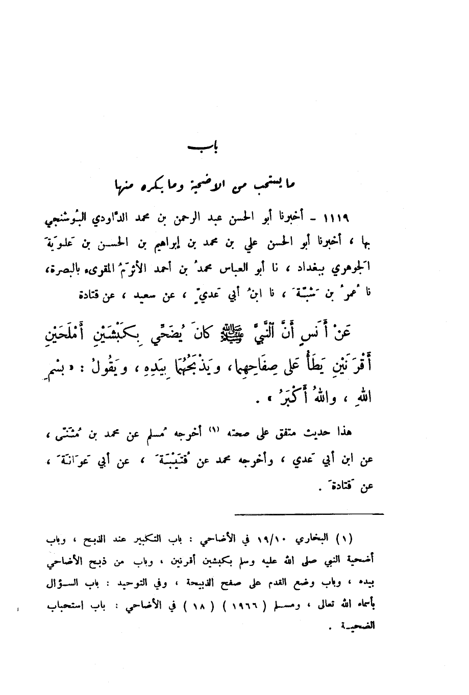 1119 - أَخْبَرَنَا أَبُو الْحَسَنِ عَبْدُ الرَّحْمَنِ بْنُ مُحَمَّدٍ الدَّاوُدِيُّ الْبُوشَنْجِيُّ بِهَا، أَخْبَرَنَا أَبُو الْحَسَنِ عَلِيُّ بْنُ مُحَمَّدِ بْنِ إِبْرَاهِيمَ بْنِ الْحَسَنِ بْنِ عَلُّوَيْهِ الْجَوْهَرِيُّ، بِبَغْدَادَ، نَا أَبُو الْعَبَّاسِ مُحَمَّدُ بْنُ أَحْمَدَ الأَثْرَمُ الْمُقْرِئُ بِالْبَصْرَةِ، نَا عُمَرُ بْنُ شَبَّةَ، نَا ابْنُ أَبِي عَدِيٍّ، عَنْ سَعِيدٍ، عَنْ قَتَادَةَ، عَنْ أَنَسٍ، أَنَّ النَّبِيَّ صَلَّى اللهُ عَلَيْهِ وَسَلَّمَ " كَانَ يُضَحِّي بِكَبْشَيْنِ أَمْلَحَيْنِ أَقْرَنَيْنِ يَطَأُ عَلَى صِفَاحِهِمَا، وَيَذْبَحُهُمَا بِيَدِهِ، وَيَقُولُ: بِسْمِ اللَّهِ، وَاللَّهُ أَكْبَرُ ".