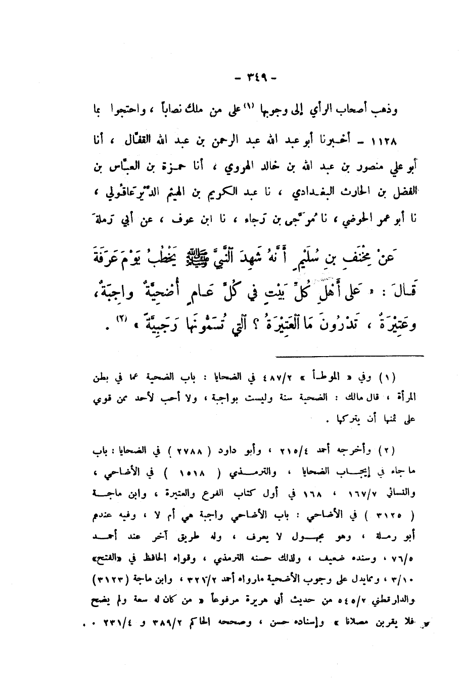 1128 - أَخْبَرَنَا أَبُو عَبْدِ اللَّهِ عَبْدُ الرَّحْمَنِ بْنُ عَبْدِ اللَّهِ الْقَفَّالُ، أَنا أَبُو عَلِيٍّ مَنْصُورُ بْنُ عَبْدِ اللَّهِ بْنِ خَالِدٍ الْهَرَوِيُّ، أَنا حَمْزَةُ بْنُ الْعَبَّاسِ بْنِ الْفَضْلِ بْنِ الْحَارِثِ الْبَغْدَادِيُّ، نَا عَبْدُ الْكَرِيمِ بْنُ الْهَيْثَمِ الدَّيْرَعَاقُولِيُّ، نَا أَبُو عُمَرَ الْحَوْضِيُّ، نَا مُرَجَّى بْنُ رَجَاءٍ، نَا ابْنُ عَوْنٍ، عَنْ أَبِي رَمْلَةَ، عَنْ مِخْنَفِ بْنِ سُلَيْمٍ، أَنَّهُ شَهِدَ النَّبِيَّ صَلَّى اللهُ عَلَيْهِ وَسَلَّمَ يَخْطُبُ يَوْمَ عَرَفَةَ، قَالَ: «عَلَى أَهْلِ كُلِّ بَيْتٍ فِي كُلِّ عَامٍ أُضْحِيَّةٌ وَاجِبَةٌ، وَعَتِيرَةٌ، تَدْرُونَ مَا الْعَتِيرَةُ؟ الَّتِي تُسَمُّونَهَا رَجَبِيَّةً».
