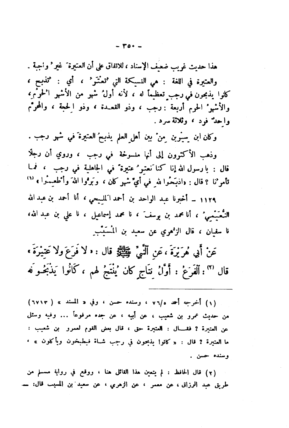 1129 - أَخْبَرَنَا عَبْدُ الْوَاحِدِ بْنُ أَحْمَدَ الْمَلِيحِيُّ، أَنا أَحْمَدُ بْنُ عَبْدِ اللَّهِ النُّعَيْمِيُّ، أَنا مُحَمَّدُ بْنُ يُوسُفَ، نَا مُحَمَّدُ بْنُ إِسْمَاعِيلَ، نَا عَلِيُّ بْنُ عَبْدِ اللَّهِ، نَا سُفْيَانُ، قَالَ الزُّهْرِيُّ: عَنْ سَعِيدِ بْنِ الْمُسَيِّبِ، عَنْ أَبِي هُرَيْرَةَ، عَنِ النَّبِيِّ صَلَّى اللهُ عَلَيْهِ وَسَلَّمَ، قَالَ: «لَا فَرَعَ وَلا عَتِيرَةَ»، قَالَ: الْفَرَعُ: أَوَّلُ نِتَاجٍ كَانَ يُنْتَجُ لَهُمْ، كَانُوا يَذْبَحُونَهُ